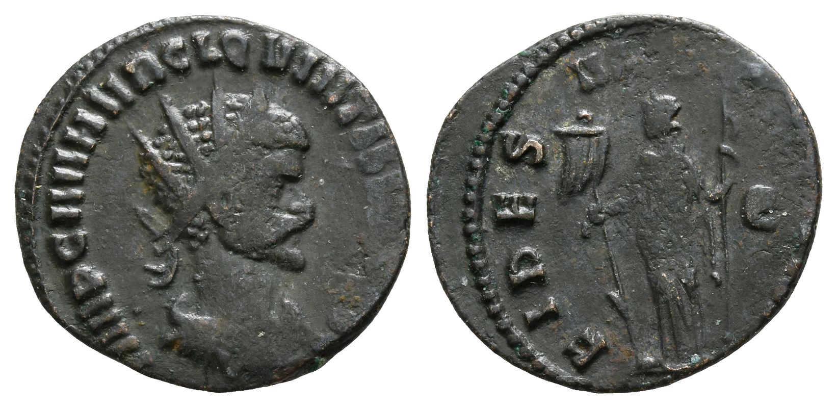 Rome mint; struck AD 270. 5th officina. IMP C M AVR CL QVINTILLVS AVG, radiate, draped and cuirassed bust to right / FIDES MILITVM, Fides standing to left, holding vexillum and sceptre; Є in right field. RIC V.1 18; MER-RIC 1152 (temporary). 2.52gr, 20mm, 6h.