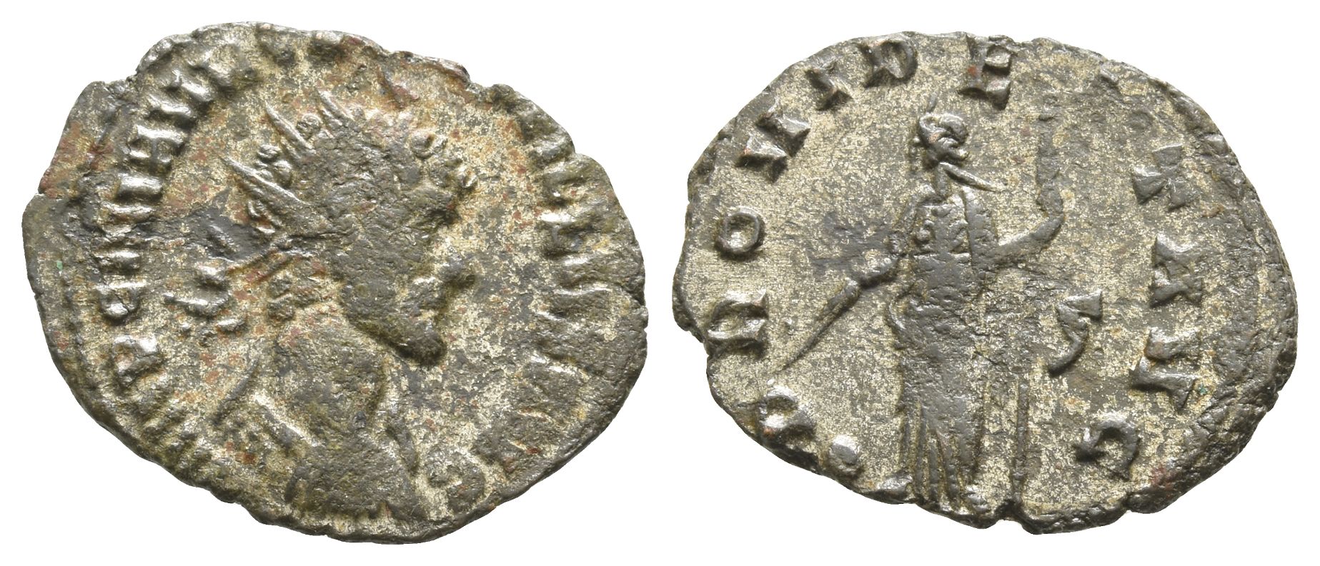 IMP C M AVR CL QVINTILLVS AVG, radiate, draped and cuirassed bust to right / PROVIDENT AVG, Providentia standing to left, holding baton over globe and sceptre; ς in right field. RIC V.1 29; MER-RIC 1161 (temporary). 2.15gr, 22mm, 5h.