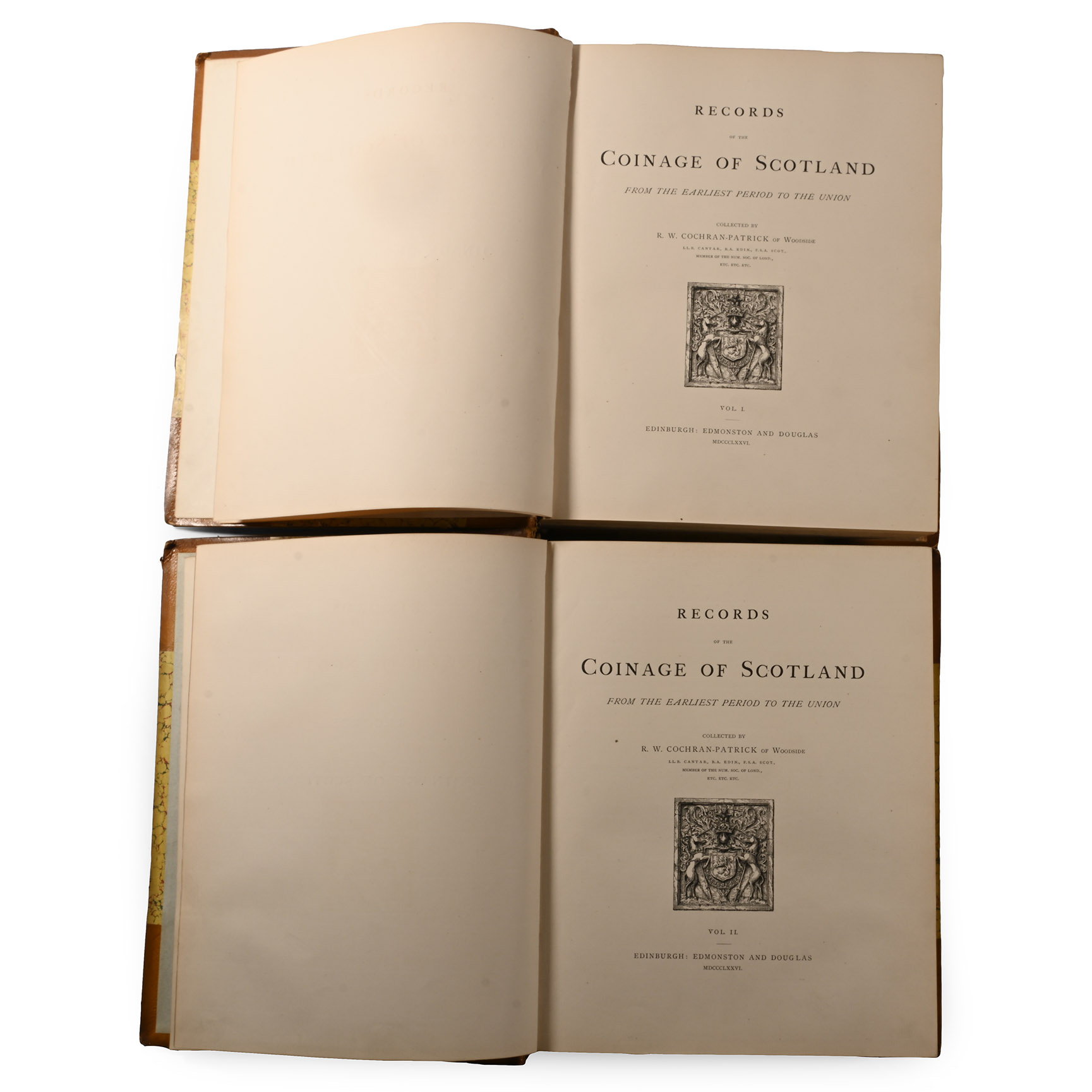 R.W.Cochran-Patrick of Woodside - 2 vols, Edinburgh, 1876, 296/359 pp, quarter-calf binding with gold titling to spine, gold block insignium to cover for Library of the Royal Numismatic Society, vol.2 with 16 photographic plates each with tissue interleaf and title page; library binding with marbled boards; old Spink Auction Lot ticket (1058, October 10, 1985); usage wear to spine and corners. 5.31 kg total, 29.5 x 24 cm each