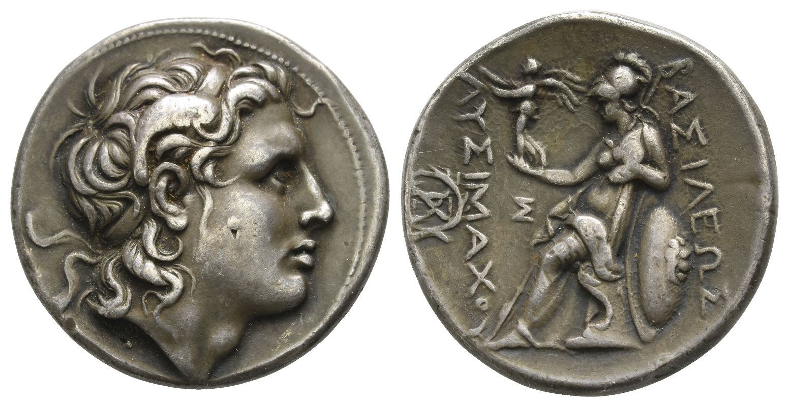 For prototype: Circa 297/6-282/1 BC. Magnesia ad Maeandrum mint. Diademed head of Alexander the Great to right with horn of Ammon over his ear / BAΣIΛEΩΣ ΛΥΣIMAXOΥ, Athena seated to left on throne, leaning her left elbow on her shield decorated with lion's head and holding Nike, crowning the king's name, in her outstretched right hand, behind, transverse spear with point below left; Σ in inner left field, monogram within wreath in outer left field. Thompson 102; HGC 3, 1750e. 12.39gr, 27mm, 12h.