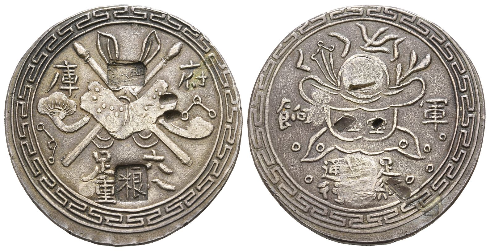 Crossed brashes with lotus flowers surrounded by Chinese ideograms / Greek design. 25.64gr, 42mm, 12h.