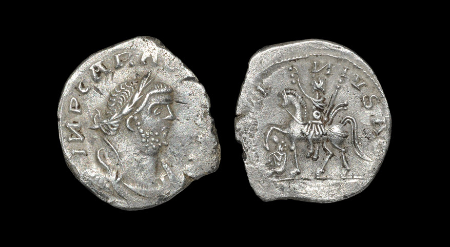 Semi-barbaric type. Obv: INP CARAVSIVS (INV?) legend with M as retrograde N, with radiate, draped bust right. Rev: ADVENTVS AVG legend with N retrograde; Carausius riding left, holding sceptre and branch, captive beneath horse's front hooves; no mintmark. 2.70 grams.