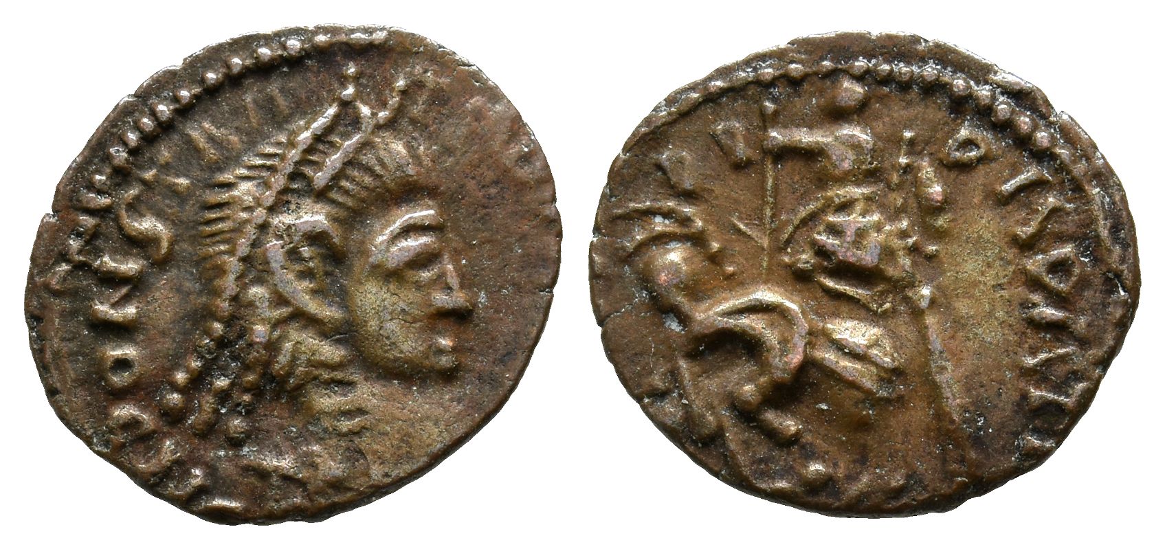 Following uncertain mint. D N ƆONSTAN-TIV[...], pearl-diademed, draped and cuirassed bust to right / [...] PP-PΛPΛTI[...], soldier standing to left, spearing fallen horseman; uncertain mintmark in exergue. SCBC 750; see also Carson and J.P.C. Kent, 'A Hoard of Roman Fourth-Century Bronze Coins from Heslington, Yorkshire' in NC Vol. 11 (1971), p. 221. 1.48gr, 17mm, 1h.