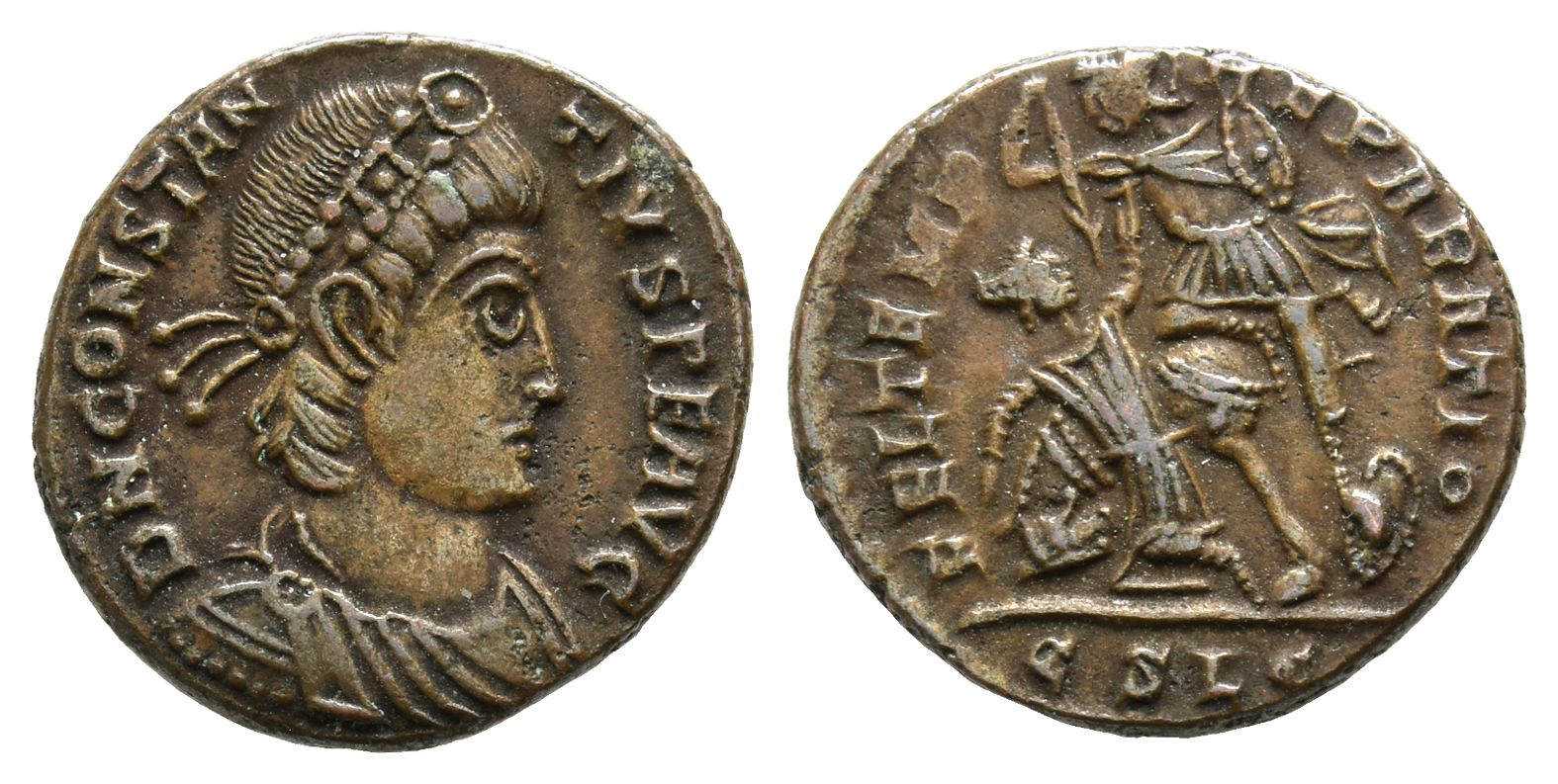 Following Lugdunum mint. D N CONSTAN-TIVS P F AVG, rosette-diademed, draped and cuirassed bust to right / FEL TEMP REPARATIO, soldier standing to left, spearing fallen horseman, round shield below; CSLG in exergue. SCBC 750. 2.88gr, 17mm, 7h.