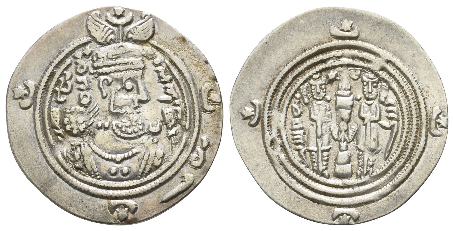 NAL (Nārmashir?) mint. Dated RY 37 (AD 627/8). Draped bust to right, wearing mural crown with two wings and star set on crescent; all within double border with star-in-crescents and legend in margin / Fire altar with ribbons flanked by attendants; star and crescent flanking flames; date to left, mint to right; all within triple border with star-in-crescents in margin. Göbl type II/3. 2.92gr, 29mm, 3h.