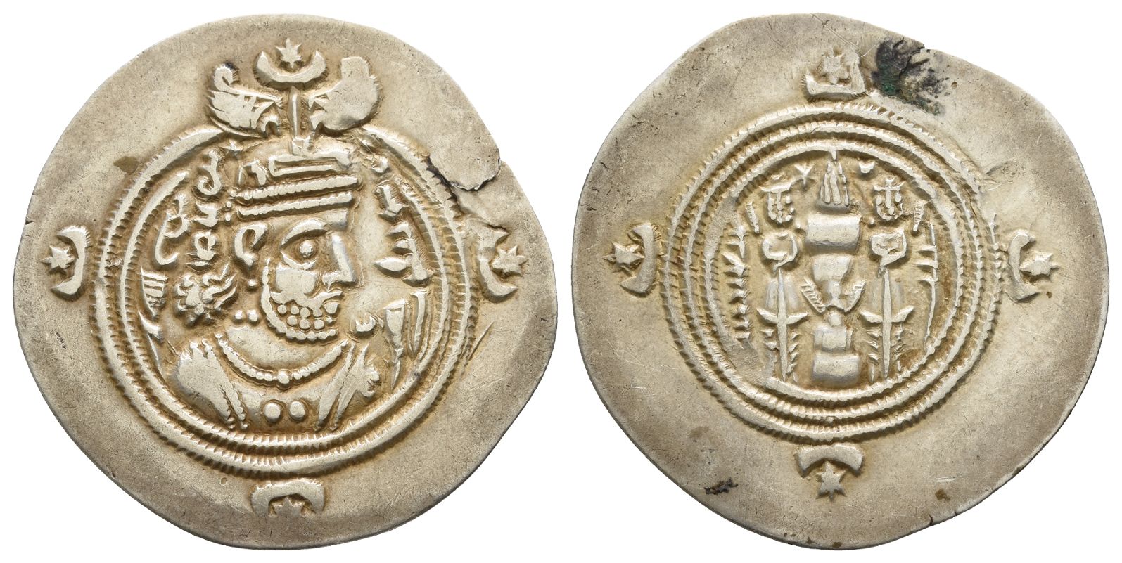 ŠY (Shiraz) mint. Dated RY 30? (AD 621). Draped bust to right, wearing mural crown with two wings and star-in-crescent; stars and legends flanking, ribbons on shoulders; all within double border with star-in-crescents in margin / Fire altar with ribbons flanked by attendants; star and crescent flanking flames; date to left, mint to right; all within triple border with star-in-crescents in margin. 4.06gr, 32mm, 10h.