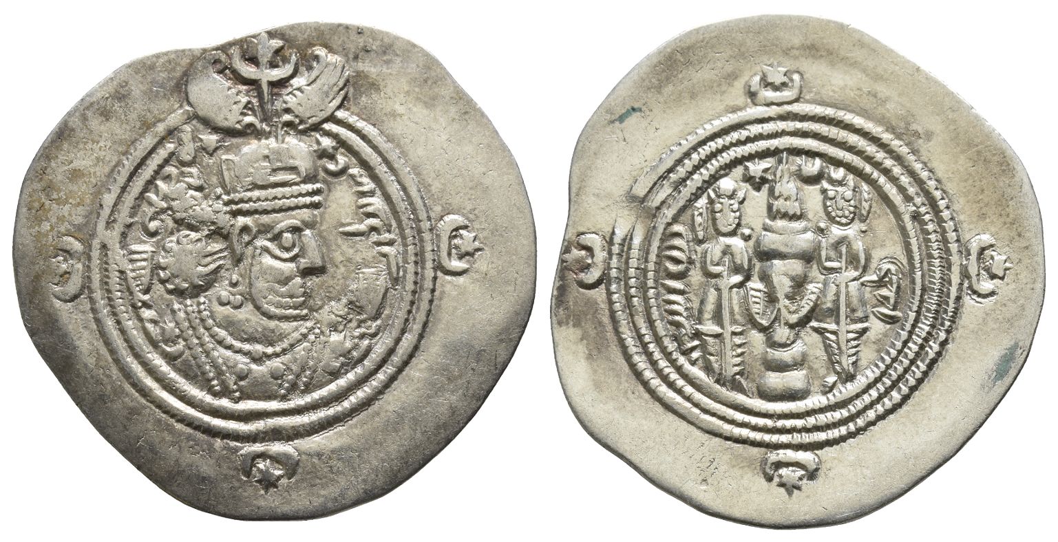 LYW (Rēv-Ardaxšir) mint. Dated RY 21 (AD 611/2). Draped bust to right, wearing mural crown with two wings, frontal crescent and star-in-crescent; stars and legends flanking, ribbon on shoulders; all within double border with star-in-crescents in margin / Fire altar with ribbons flanked by attendants; star and crescent flanking flames; date to left, mint to right; all within triple border, with star-in-crescents in margin. SC Tehran -. 4.03gr, 32mm, 3h.