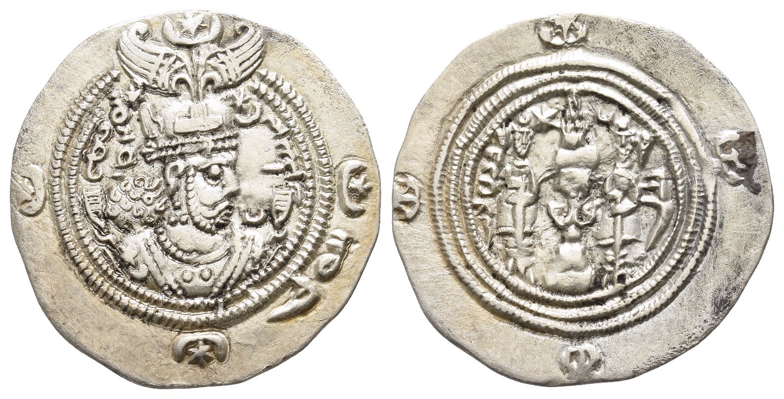 Back to previous pageSasanian Kingdom, Husrav (Khosrau) II AR Drachm. Dated RY 13 (AD 604). AY (Ērān-xvarrah-Šābuhr [Susa]) mint.