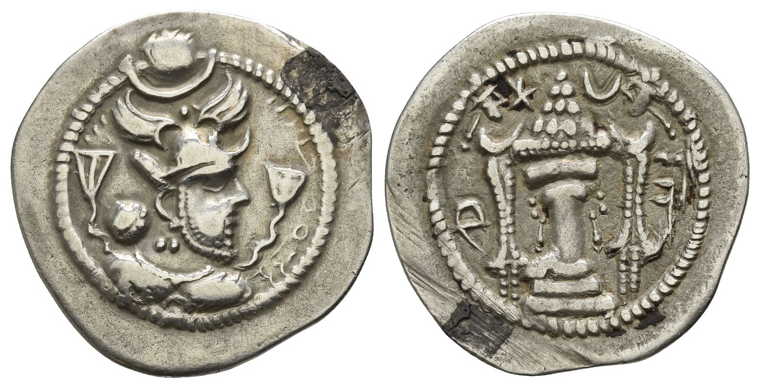 AY (Ērān-xvarrah-Šābuhr [Susa]) mint. Struck circa AD 477-484. Type 3. Bust to right, wearing crown with two wings, frontal crescent, and korymbos set on crescent, ribbon over each shoulder / Fire altar with ribbons; flanked by two attendants; star and crescent flanking flames. SNS type IIIb/1e; Sunrise -. 3.91gr, 27mm, 3h.