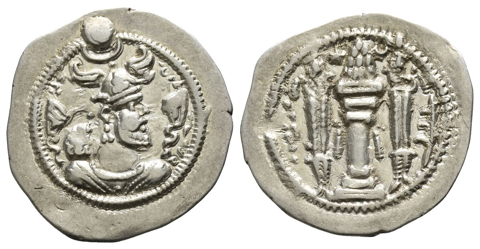 ShI (Shiz) mint. No date. Bust to right, wearing crown with two wings, frontal crescent, and korymbos set on crescent, ribbon over each shoulder / Fire altar with ribbons; flanked by two attendants; star and crescent flanking flames. Göbl type III/1. 4.02gr, 27mm, 3h.