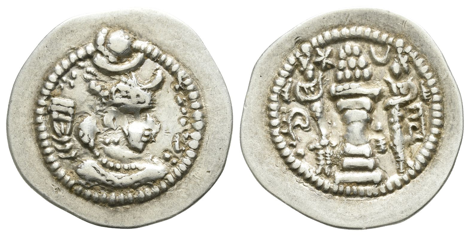 AT (Ādurbādagān) mint. Bust to right, wearing crown, frontal crescent, and korymbos set on crescent / Fire altar with ribbons; flanked by two attendants; star and crescent flanking flames. SNS III, type IIa/1e. 4.17gr, 28mm, 3h.