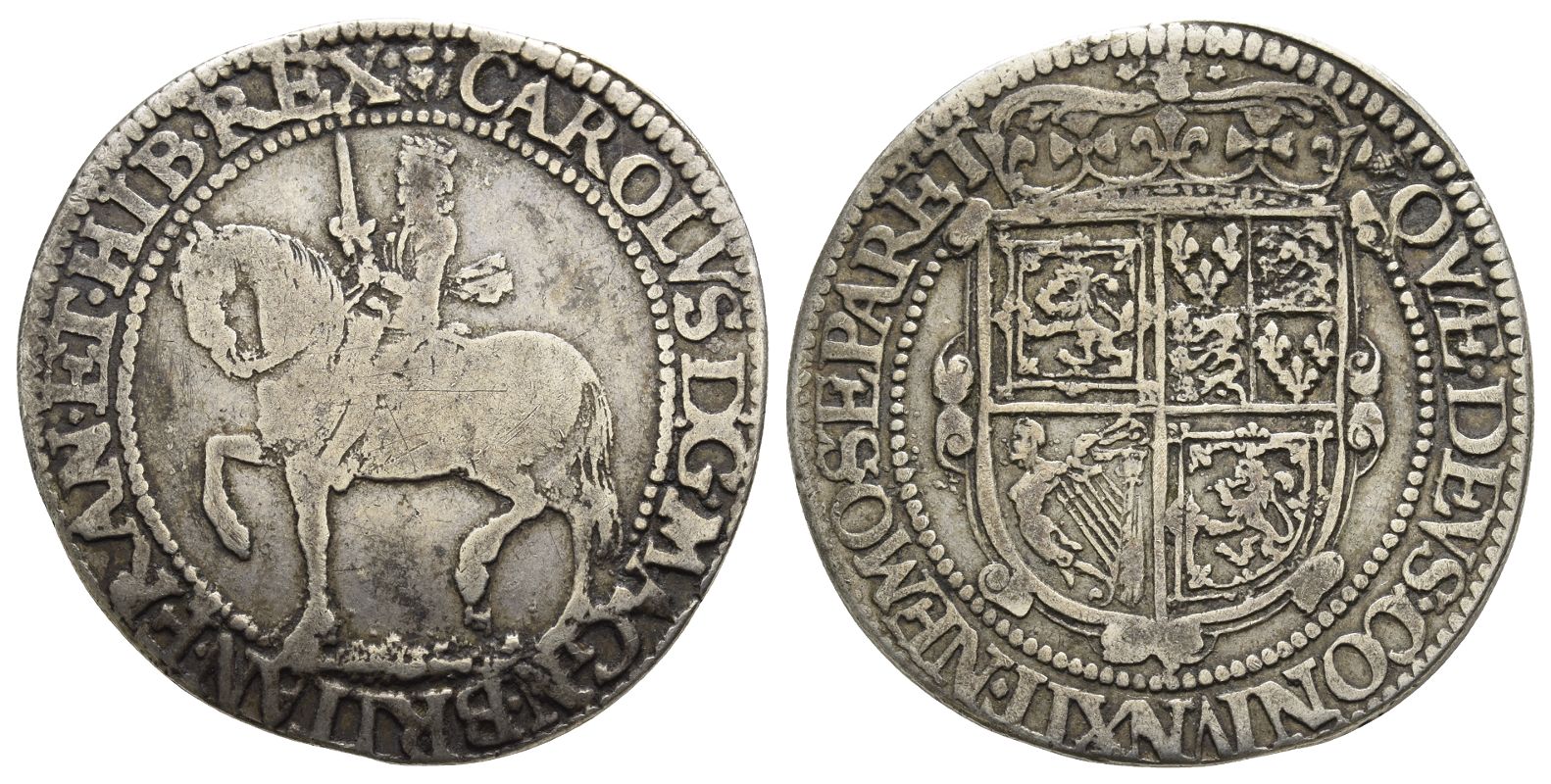 (Thislte) ♦ CAROLVS ♦ D:G ♦ MAGN ♦ BRITAN ♦ FRAN ♦ ET ♦ HIB ♦ REX ♦, Charles on horseback to left, holding sword and reigns; rough ground below; F prostrate by horse's rear hoof / (Thistle) QVÆ ♦ DEVS : CONIVNXIT ♦ NEMO SEPARET, crowned coat-of-arms. SCBC 5556. 14.63gr, 35mm, 6h.