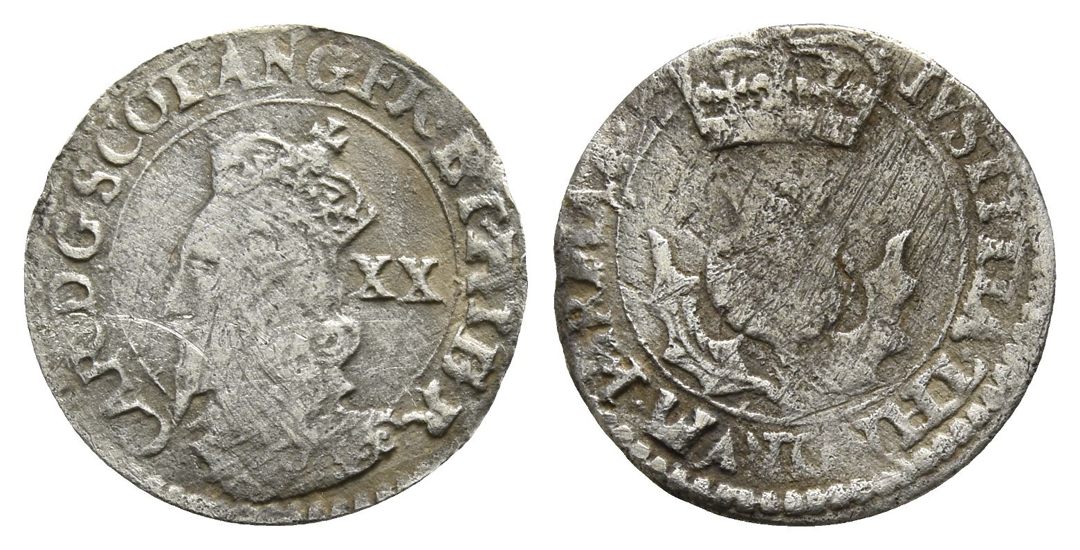 Edinburgh mint. Third coinage. Struck 1637-1642. CAR D G SCOT • ANG FR • ET • HIB R, crowned bust to left; XX (mark of value) behind / IVSTITIA • THRONVM • FIRMAT • [..?], crowned thistle. Cf. SCBC 5586 (B after reverse legend). 0.73gr, 16mm, 12h.