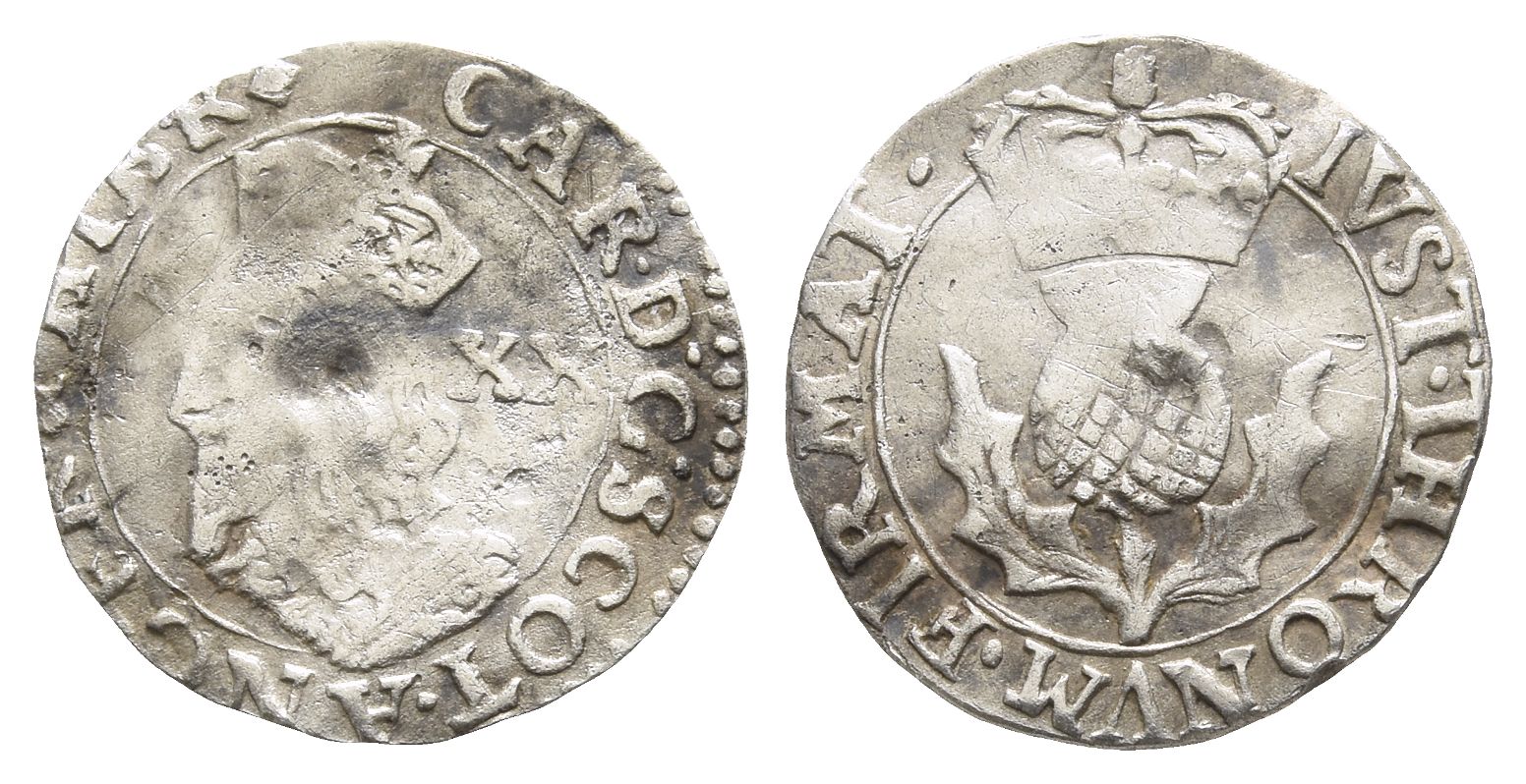 CAR • D • G • SCOT • ANG • FR • & • HIB • R ♦, crowned bust to left; XX (mark of value) behind / IVST • THRONVM • FIRMAT •, crowned thistle. SCBC 5591. 0.78gr, 16mm, 2h.