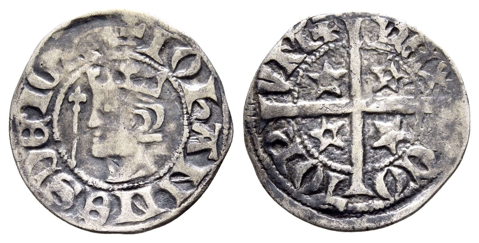 ✠ IOҺANNЄS DЄI GRA, crowned head to left; lis-tipped sceptre before / RЄX SCO-TOR-VM ✠, long cross pattée; voided mullets of five points in quarters. SCBI 35 (Ashmolean & Hunterian), 311-12; SCBC 5071. 1.32gr, 19mm, 12h.