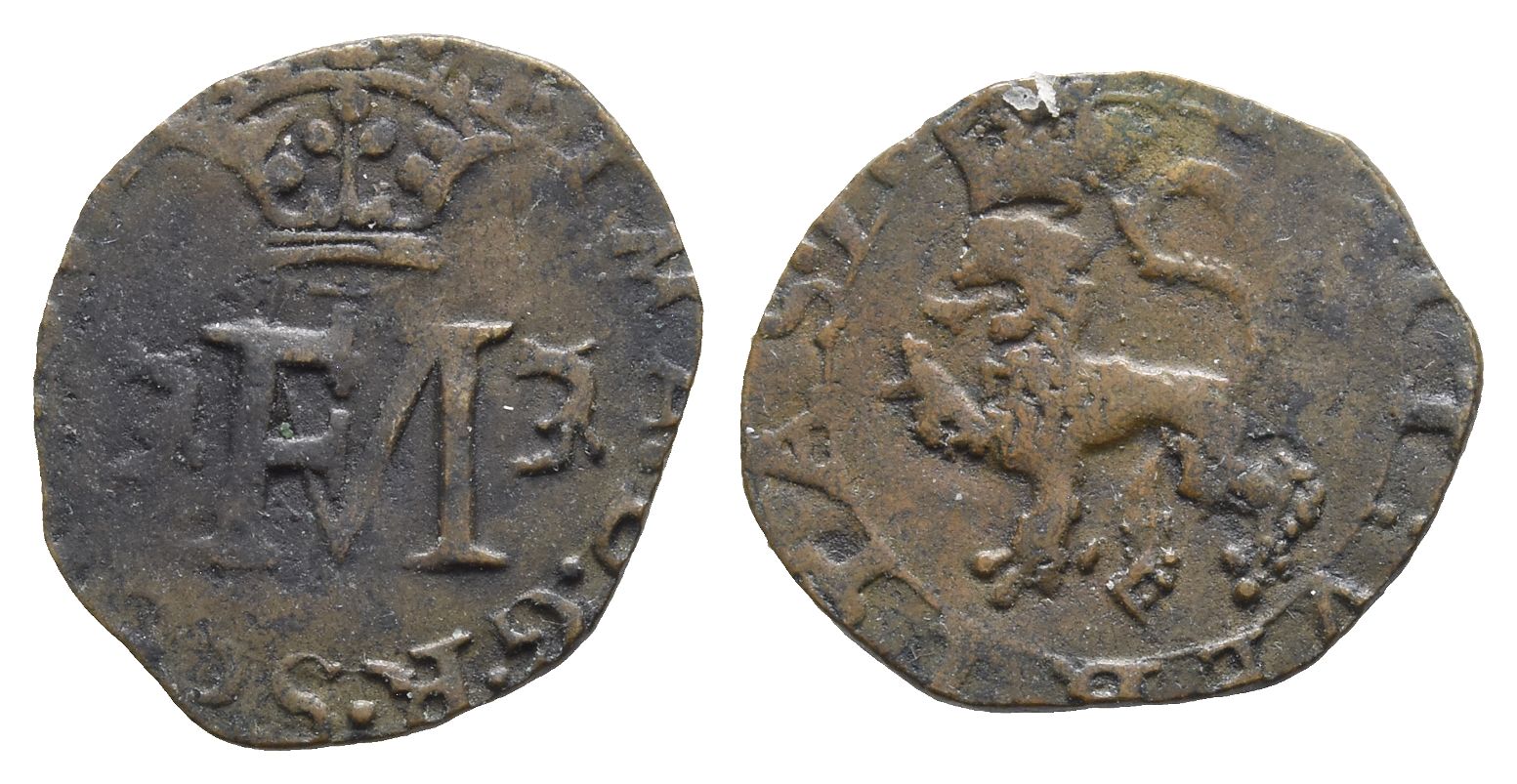Crowned FM monogram; dolphins flanking, heads to left / Crowned lion rampant to left. Cf. SCBC 5450. 1.08gr, 17mm, 3h.