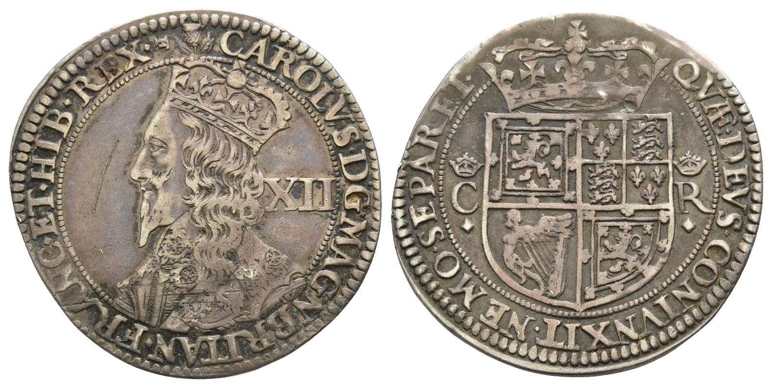(Thistle) CAROLVS ♦ D : G ♦ MAGN ♦ BRITAN ♦ FRANC ♦ ET ♦ HIB ♦ REX ♦, crowned and armored bust to left; XII (mark of value) to right; horizontal F at end of legend / QVÆ ♦ DEVS ♦ CONIVNXIT ♦ NEMO ♦ SEPARET ♦, crowned coat-of-arms; across field, crowned C R above lozenges. SCBI 35 (Ashmolean & Hunterian) 1502-8; SCBC 5561. 5.72gr, 31mm, 6h.