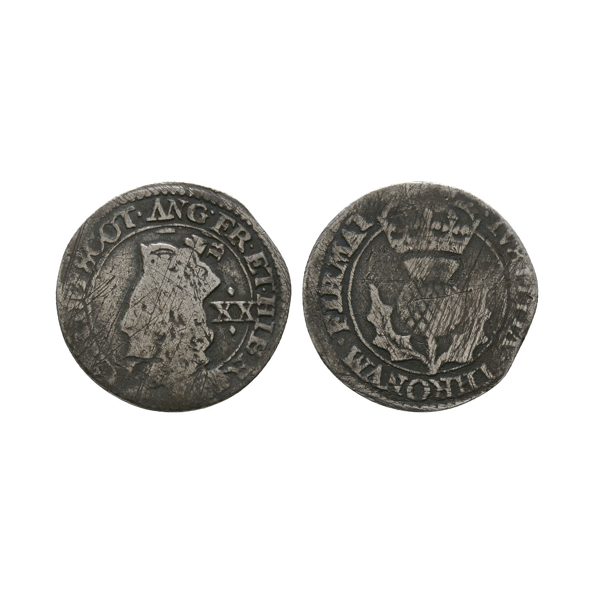 Second coinage. Obv: profile bust with XX behind and CAR D G MAG BRIT FRAN ET HIB R legend. Rev: crowned thistle with IVST THRONVM FIRMAT legend. 0.80 grams, 15 mm.