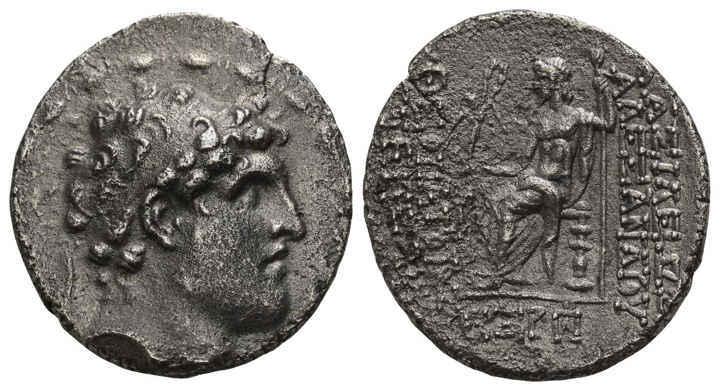 Antioch on the Orontes mint. Dated SE 165 (148/7 BC). Diademed head to right / Zeus Nikephoros enthroned to left holding sceptre; BAΣIΛEΩΣ AΛEΞANΔPOY to right, ΘEOΠATOPOΣ EYEPΓETOY to left, EΞP (date) and monogram in exergue. SC 1784.4c; HGC 9, 875a. 15.04gr, 28mm, 1h.