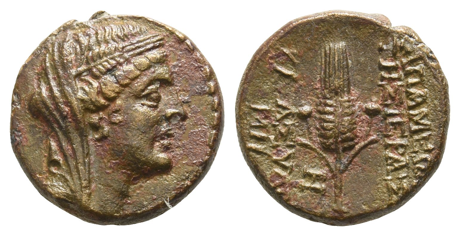Veiled bust of Demeter to right, wearing wreath of grain ears / AΠAMEΩN THΣ IEPAΣ KAI AΣYΛOY, grain ear between two poppies; to inner left, H (date); to outer left, MH. Lindgren I 2030; HGC 9, 1430 corr. (date). 3.64gr, 16mm, 12h.