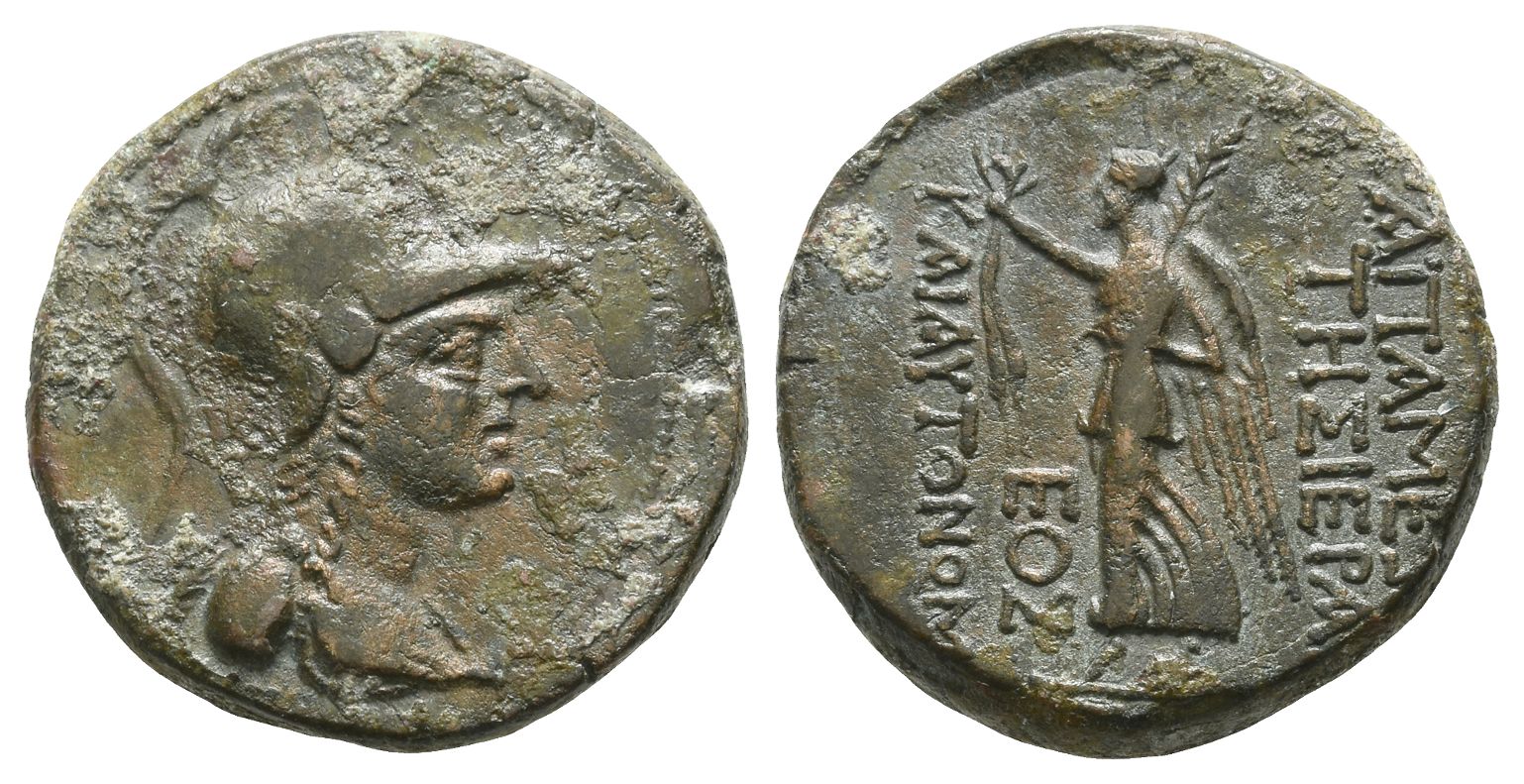 Helmetted and draped bust of Athena to right / ΑΠΑΜΕΩΝ ΤΗΣ ΙΕΡΑΣ ΚΑΙ ΑΥΤΟΝΟΜΟΥ, Nike advancing to left, holding wreath and palm; EOΣ (date) to inner left, [letters?] in exergue. RPC I 4337; DCA 413; HGC 9, 1424. 7.98gr, 21mm, 12h.