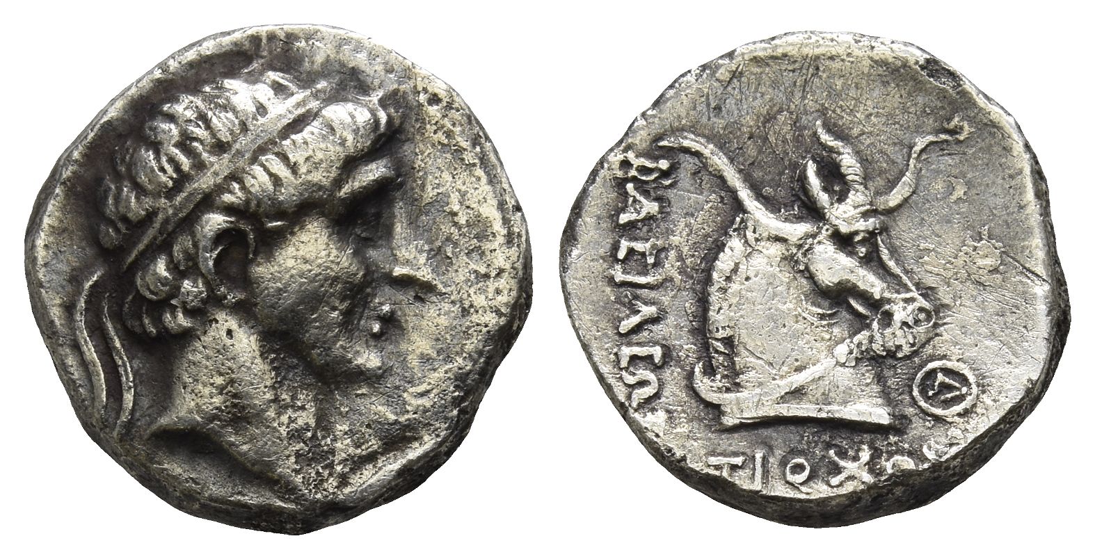 Aï Khanoum; struck circa 280-271 BC. Diademed head to right / Horned and bridled horse's head to right; ΒΑΣΙΛΕΩ[Σ] behind, [ΑΝ]ΤΙΟΧΟΥ below; Δ within circle before. SC 432.3; SMAK A1DH; HGC 9, 136. 3.79gr, 15mm, 6h.