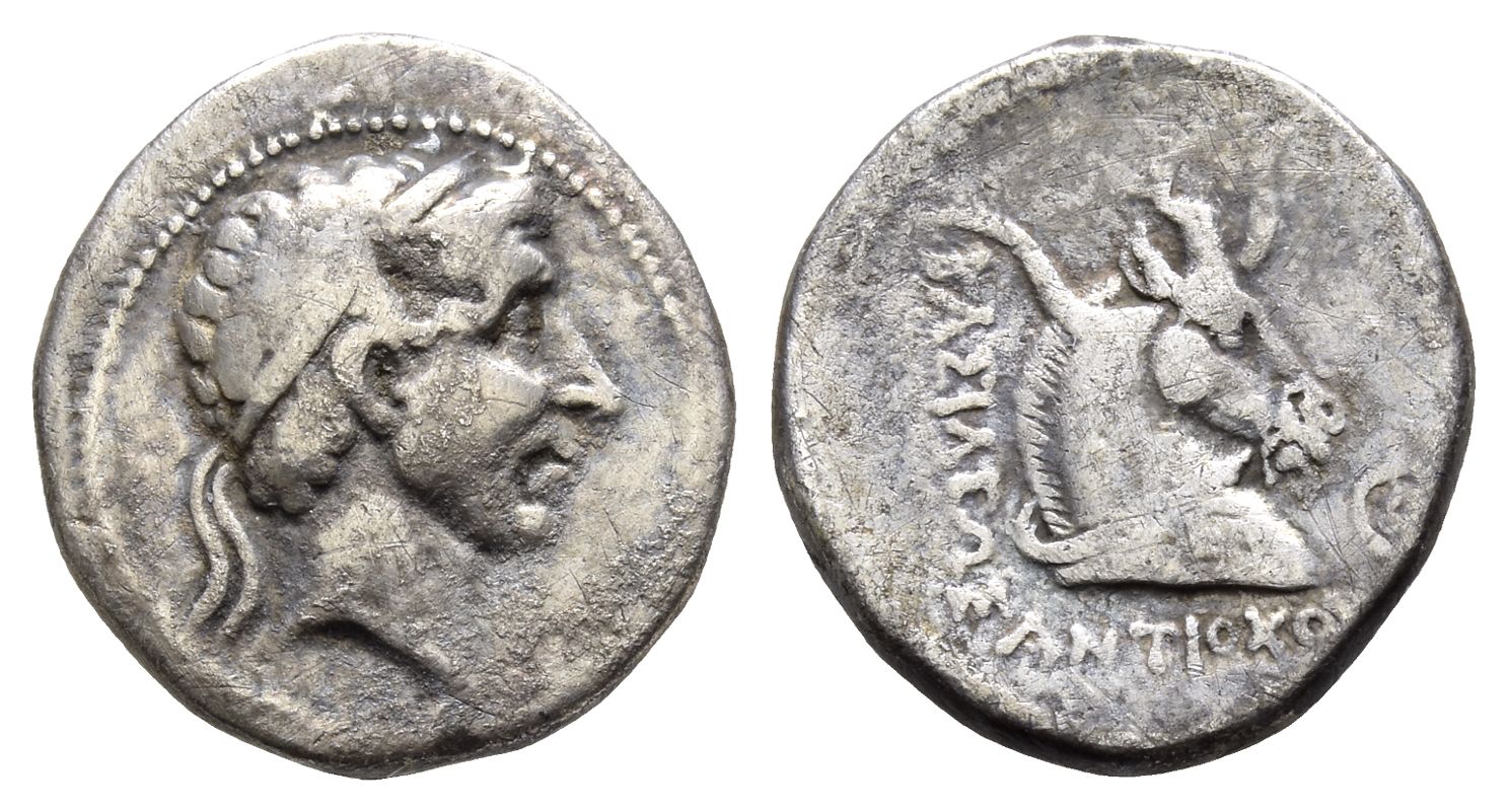 Diademed head to right / Horned and bridled horse's head to right; ΒΑΣΙΛΕΩΣ behind, ΑΝΤΙΟΧΟΥ below; monogram in circle before. SC 431.2; ESM 679. 3.57gr, 17mm, 6h.