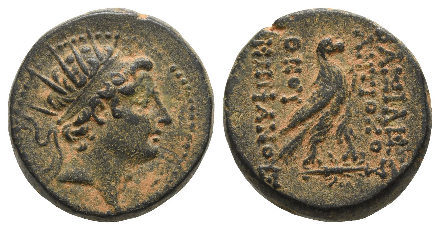 Radiate and diademed head right / BAΣIΛEΩΣ ANTIOXOY in two lines to right, ΘEOY EΠIΦANOVΣ in two lines to left, eagle standing right. SC 1415; HGC 9, 655. 9.63gr, 21mm, 12h.