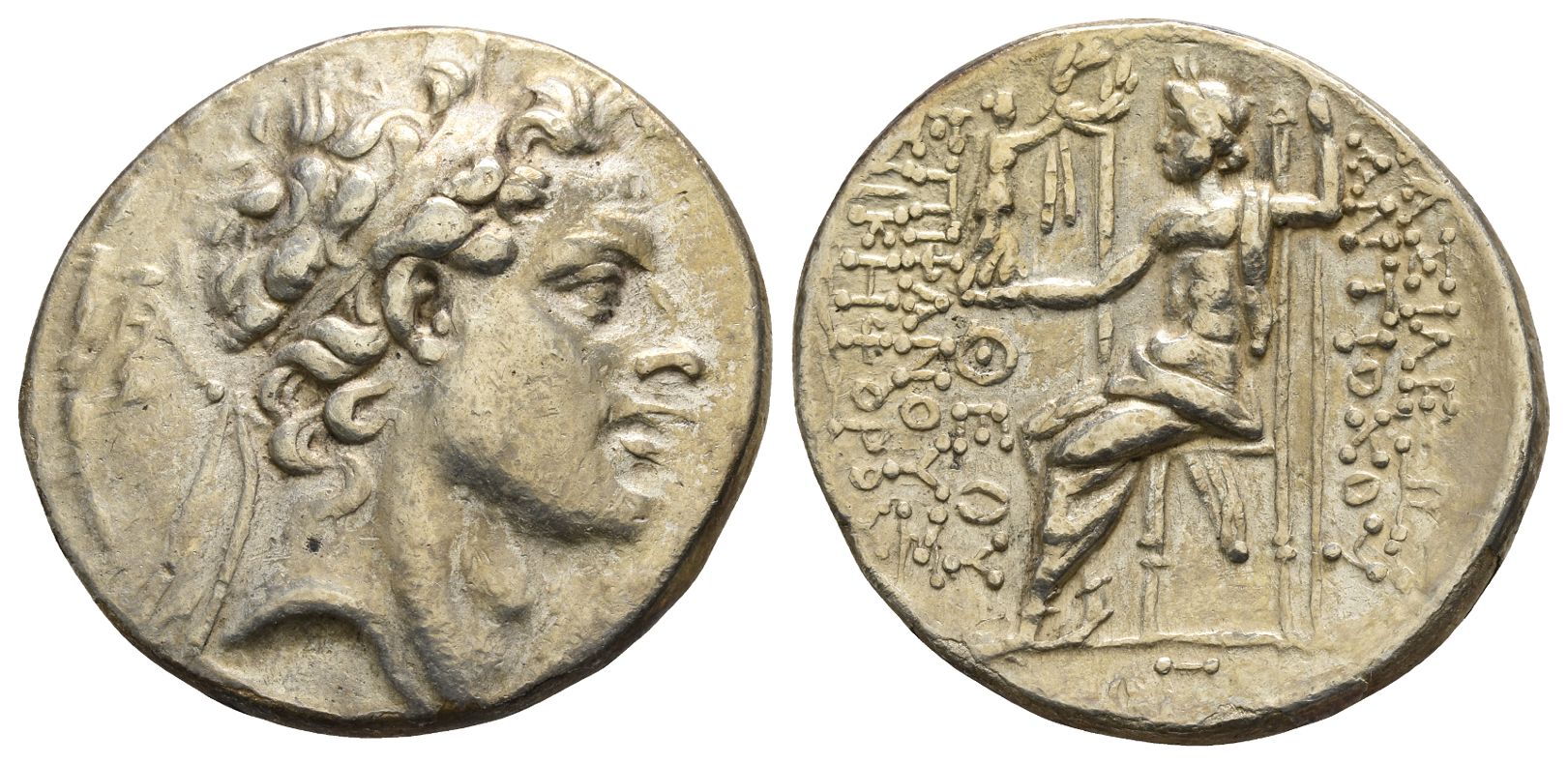 Diademed head to right; monogram of AB behind / BAΣIΛEΩΣ ANTIOΧOY ΘEOY EΠIΦANOYΣ NIKHΦOPOY, Zeus seated to left on high-backed throne, right leg drawn back, holding sceptre with his left hand and Nike with wreath in his right; palm frond to outer left, AΓ in exergue. SC 1476.1b; Mørkholm 7; HGC 9, 620c. 16.80gr, 31mm, 12h.