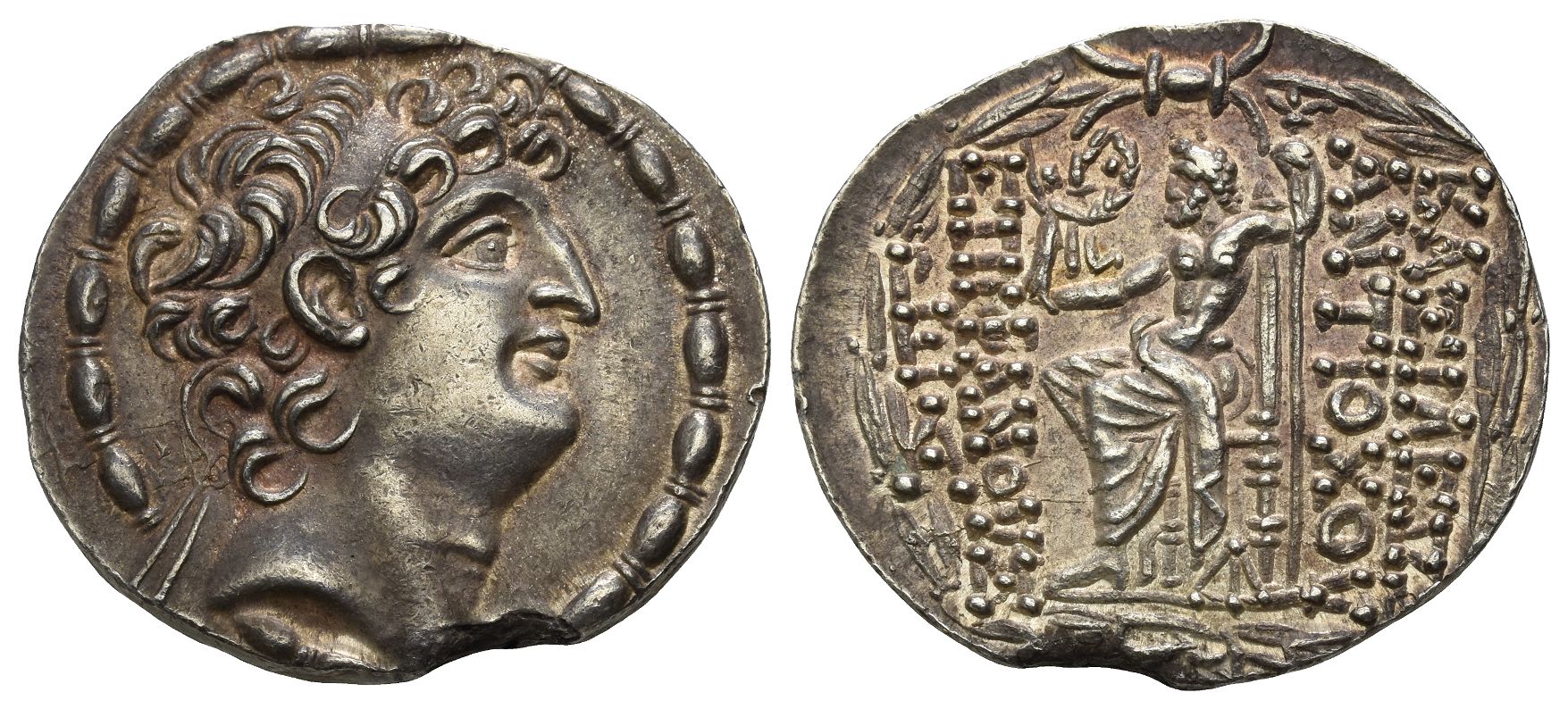 Antioch mint; struck circa 109-96 BC. Diademed head of Antiochos to right within filleted border / ΒAΣΙΛEΩΣ ΑNTIOXOY EΠIΦANOYΣ, Zeus Nikephoros seated to left, holding sceptre; monogram of PE above A in outer left field, control mark beneath throne; all within wreath. SC 2309.2c. 16.06gr, 31mm, 12h.