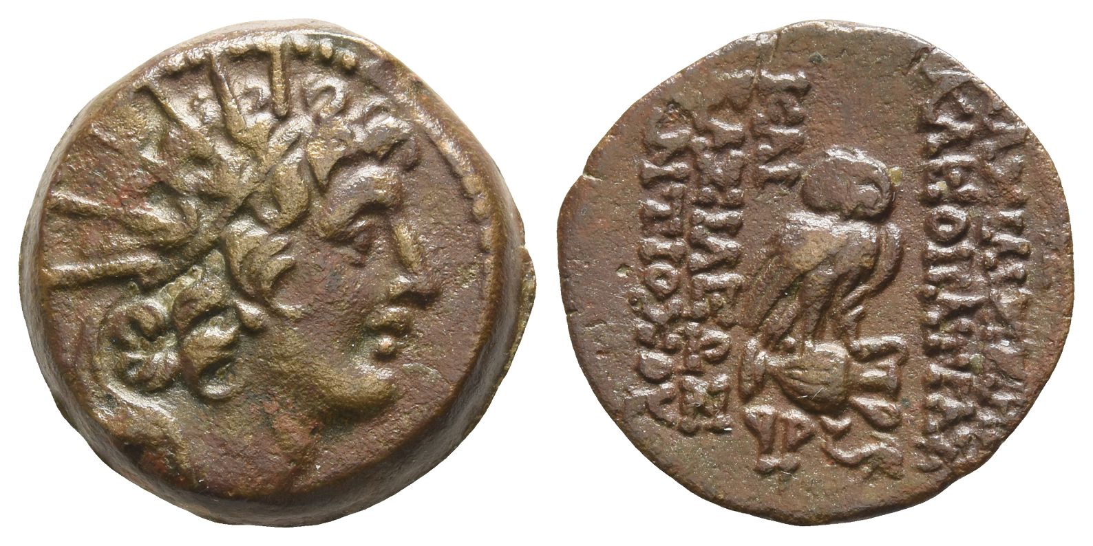 Radiate and diademed head to right / Owl standing to right, head facing, on overturned amphora; BAΣIΛIΣΣHΣ KΛEOΠATPAΣ in two lines to right, KAI BAΣIΛEΩΣ ANTIOXOY in three lines to left; I [E] to outer right; below, ꟼP (date) and dolphin to right. SC 2263.3c; SNG Spaer 2448. 6.70gr, 20mm, 12h.