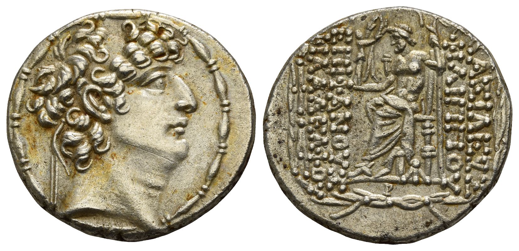 Antioch on the Orontes mint. Struck circa 88/7–76/5 BC. Diademed head to right / Zeus Nikephoros seated to left on throne, holding sceptre; ΒΑΣΙΛΕΩΣ ΦΙΛΙΠΠΟY to right, ΕΠΙΦΑΝΟYΣ ΦΙΛΑΔΕΛΦΟY to left; to outer left, Φ above A; monogram beneath throne, P in exergue; all within wreath. SC 2463.3i; HGC 9, 1319. 15.81gr, 29mm, 1h.