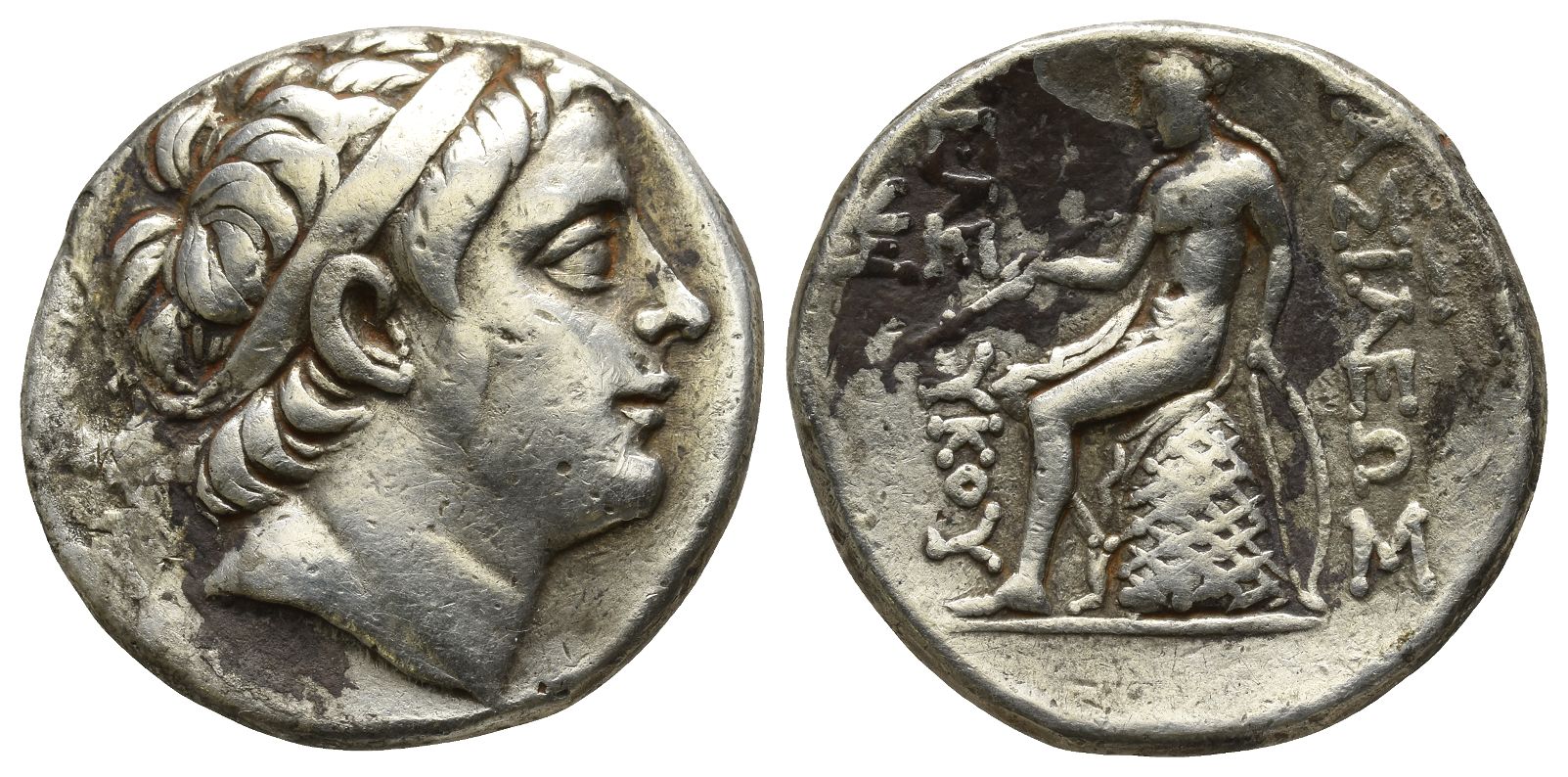 Antiochia on the Orontes mint. Diademed head of Seleukos III to right / [B]AΣIΛEΩΣ ΣΕΛΕ-ΥΚΟΥ, Apollo Delphios, nude but for chlamys draped from his waist, wearing laurel wreath and seated on omphalos to left, holding arrow with his right hand and resting his left on a bow leaning against the omphalos behind him; monogram of ΞΥ to outer left and monogram of ΩΡ to outer right. SC 921.1; HGC 9, 414c. 16.54gr, 28mm, 1h.