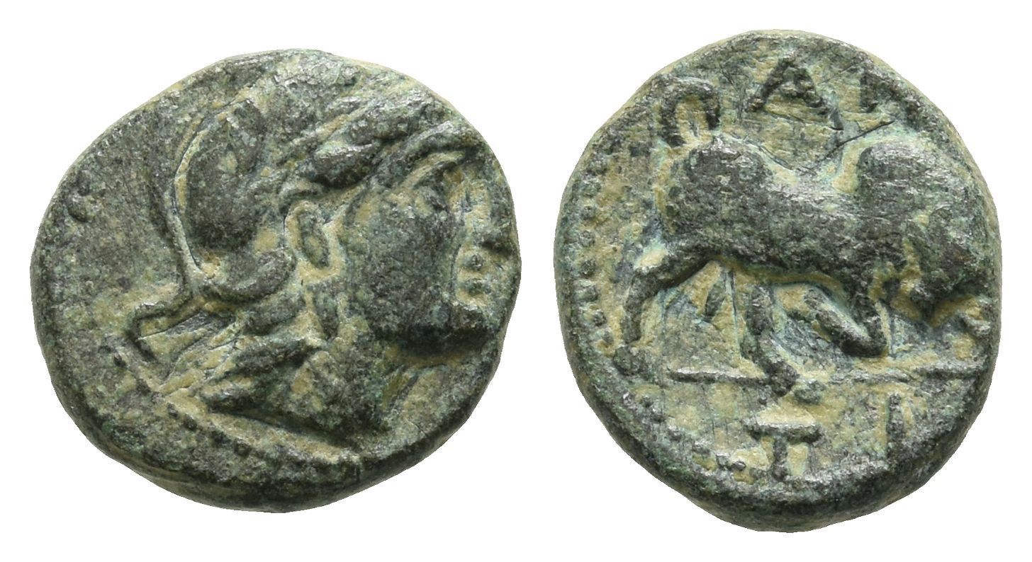 Male head to right, wearing laureate and crested Attic helmet / AN-TI, bull butting to right. Cf. SC 354 (Apollo; perhaps Antioch on the Orontes); Roma Numismatics, e-Sale 112, 529 (hammer: 850 GBP); otherwise unpublished. 1.56gr, 12mm, 10h.