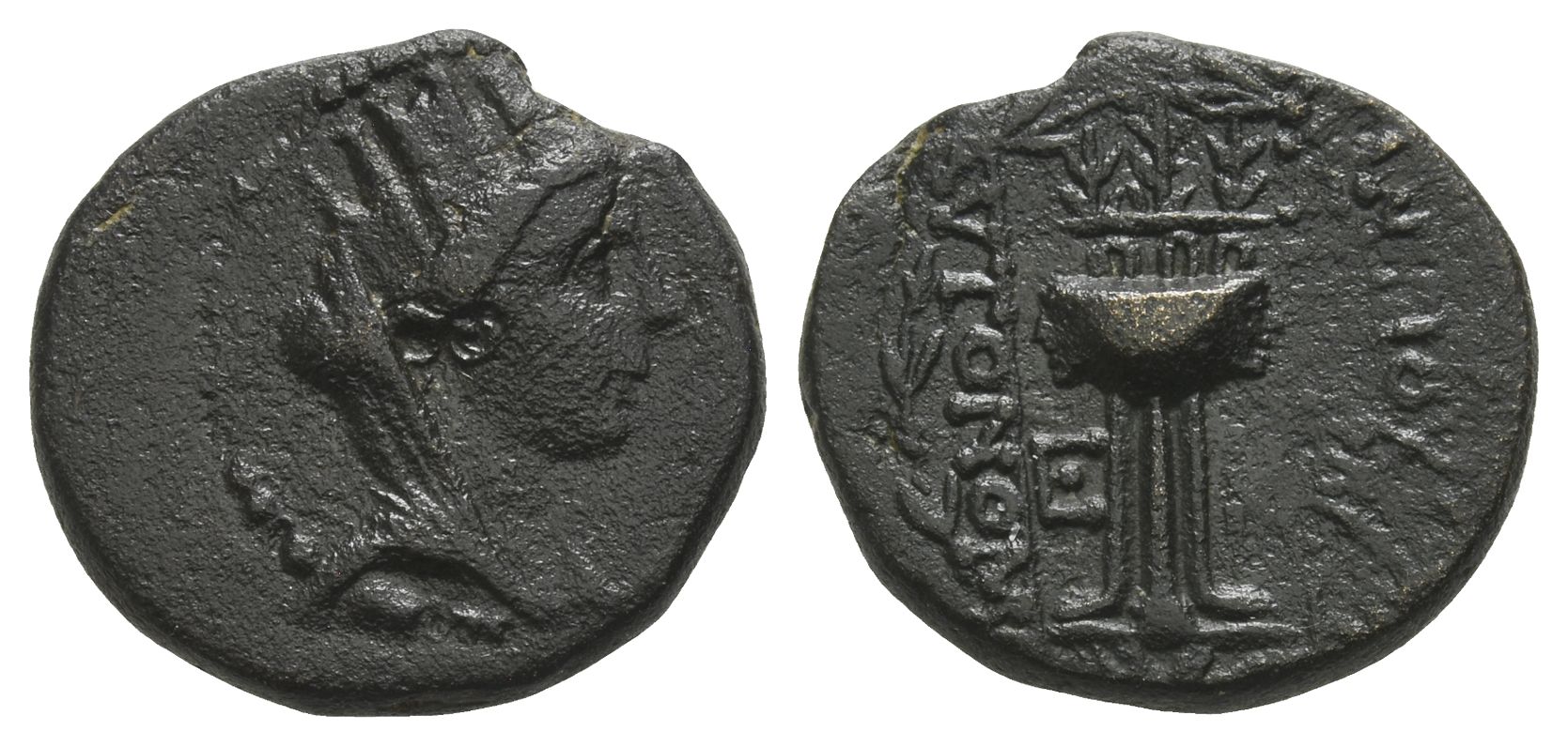 Dated Actian Era year 25 (7/6 BC). Pseudo-autonomous issue. Turreted, draped, and veiled bust of Tyche to right / Tripod-lebes containing three laurel branches; ΑΝΤΙΟΧ[ΕΩΝ ΜΗΤΡΟ]ΠΟΛ[ΕΩΣ] to right, ΑΥΤΟΝΟΜ[ΟΥ] to left, E-[K] (date) flanking tripod; all within wreath. RPC I 4243; McAlee 89. 4.75gr, 19mm, 12h.