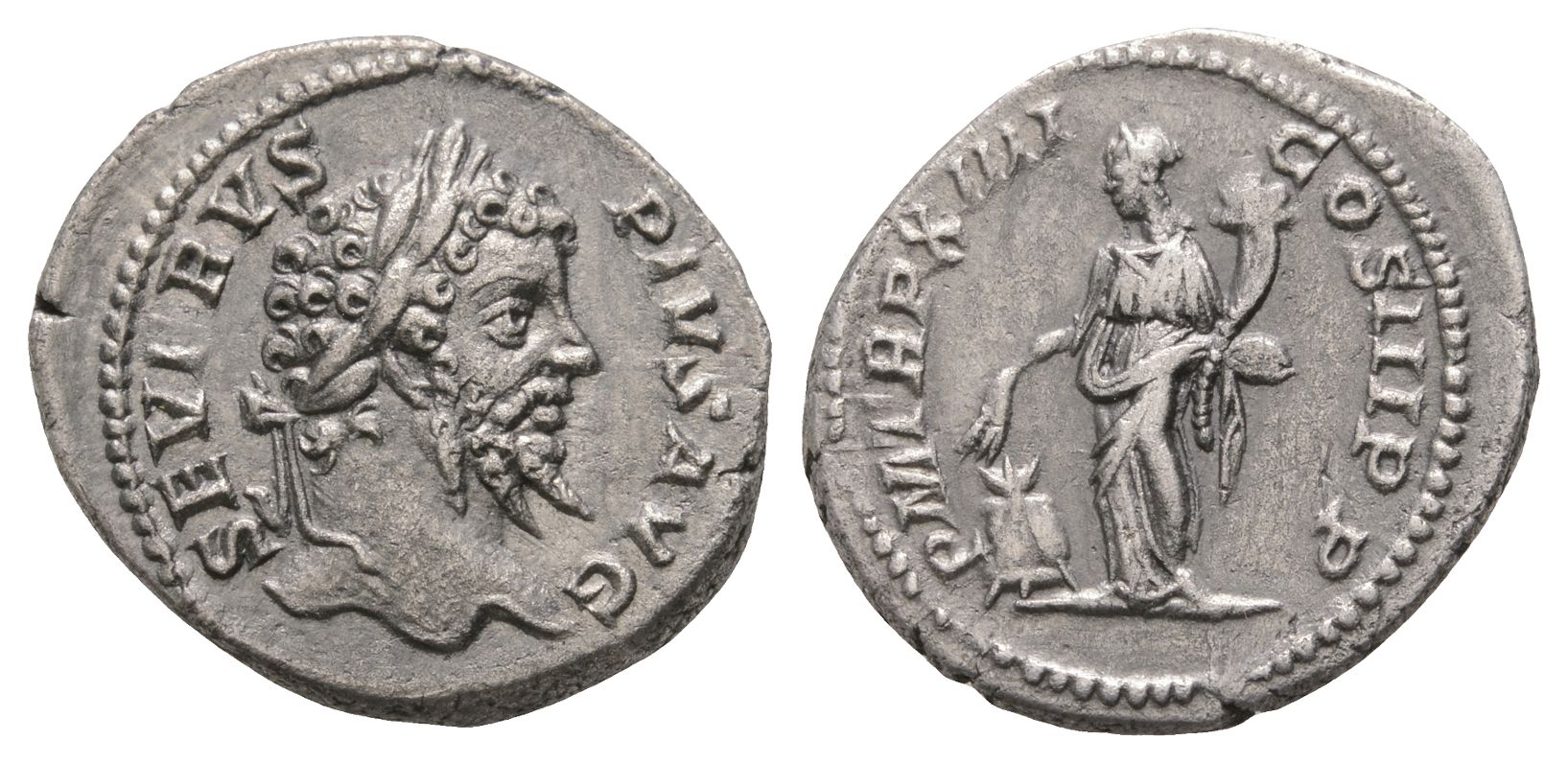 Rome mint; struck AD 206. SEVERVS PIVS AVG, laureate head to right / P M TR P XIIII COS III P P, Annona standing facing, head to left, holding corn ears over modius with her right hand and cornucopia with left. RIC IV 200; BMCRE 489; RSC 476. 2.91gr, 20mm, 6h