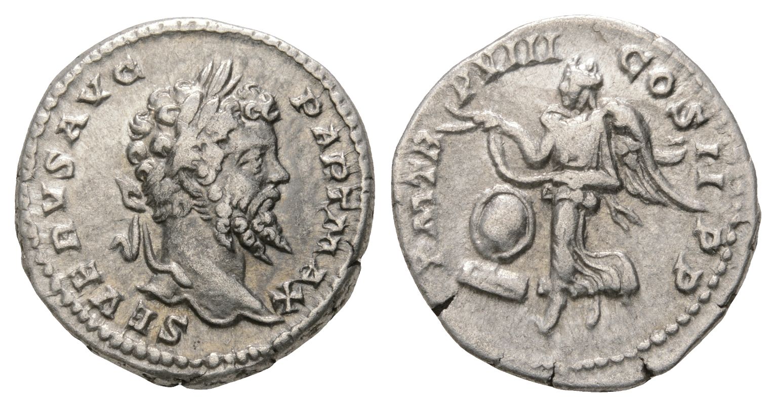 Rome mint; struck AD 200-201. SEVERVS AVG PART MAX, laureate head to right / P M TR P VIII COS II P P, Victory flying to left holding open wreath in both hands over round shield set on low base. RIC IV 150; BMCRE 175; RSC 454. 3.34gr, 19mm, 1h