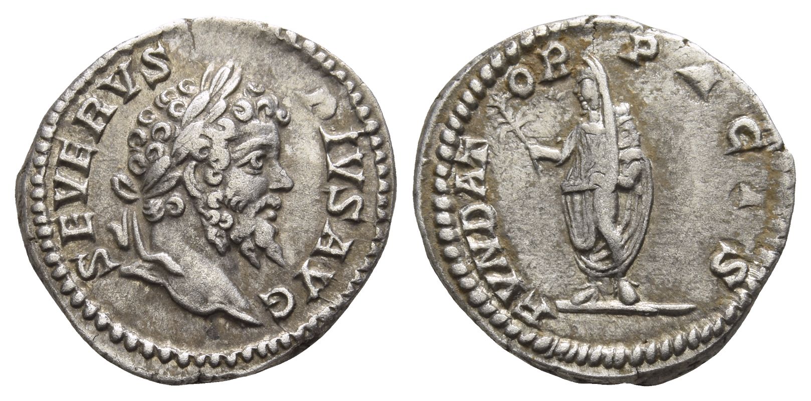 SEVERVS PIVS AVG, laureate head to right / FVNDATOR PACIS, emperor, veiled and togate, standing to left, holding branch and roll. RIC IV 265; BMCRE 330; RSC 205. 3.02gr, 19mm, 12h.