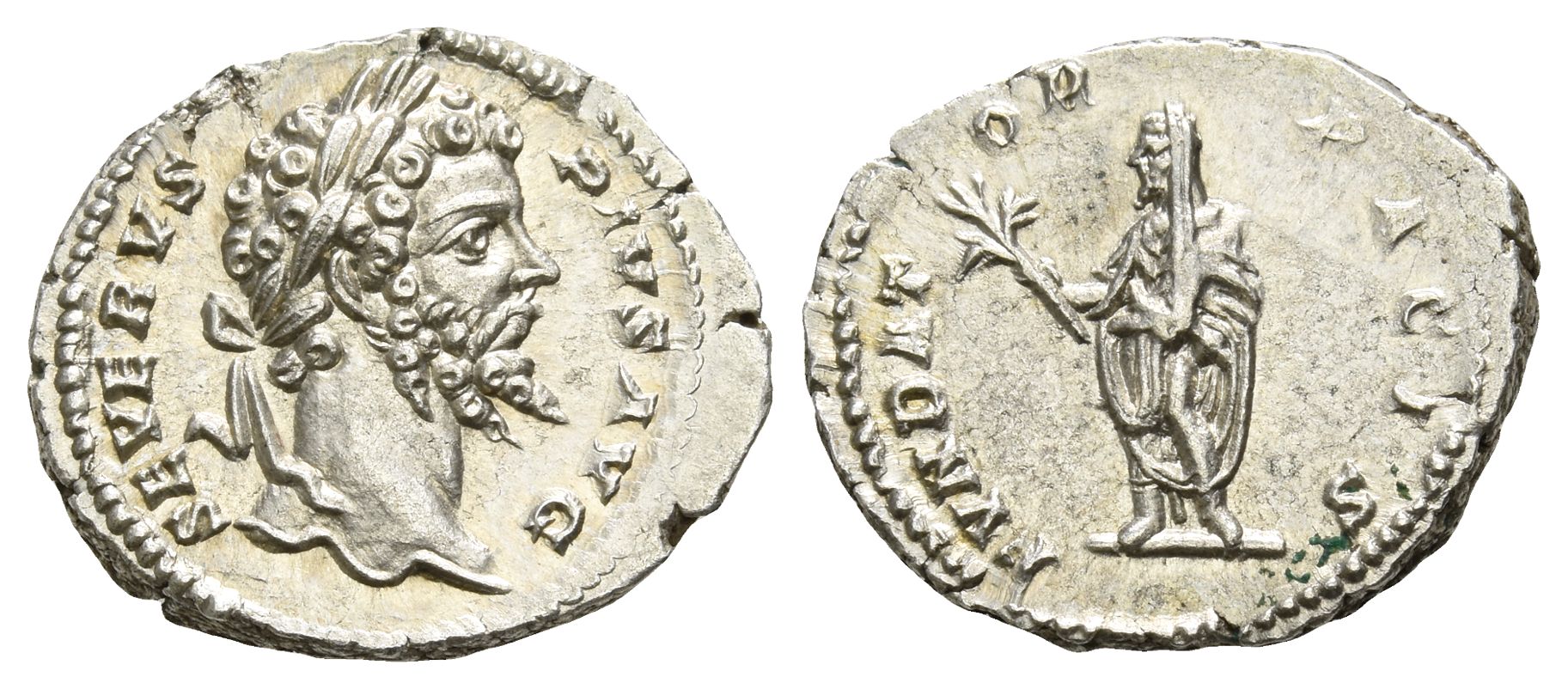 SEVERVS PIVS AVG, laureate head to right / FVNDATOR PACIS, emperor, veiled and togate, standing to left, holding branch and roll. RIC IV 265; BMCRE 330; RSC 205. 3.47gr, 20mm, 6h.