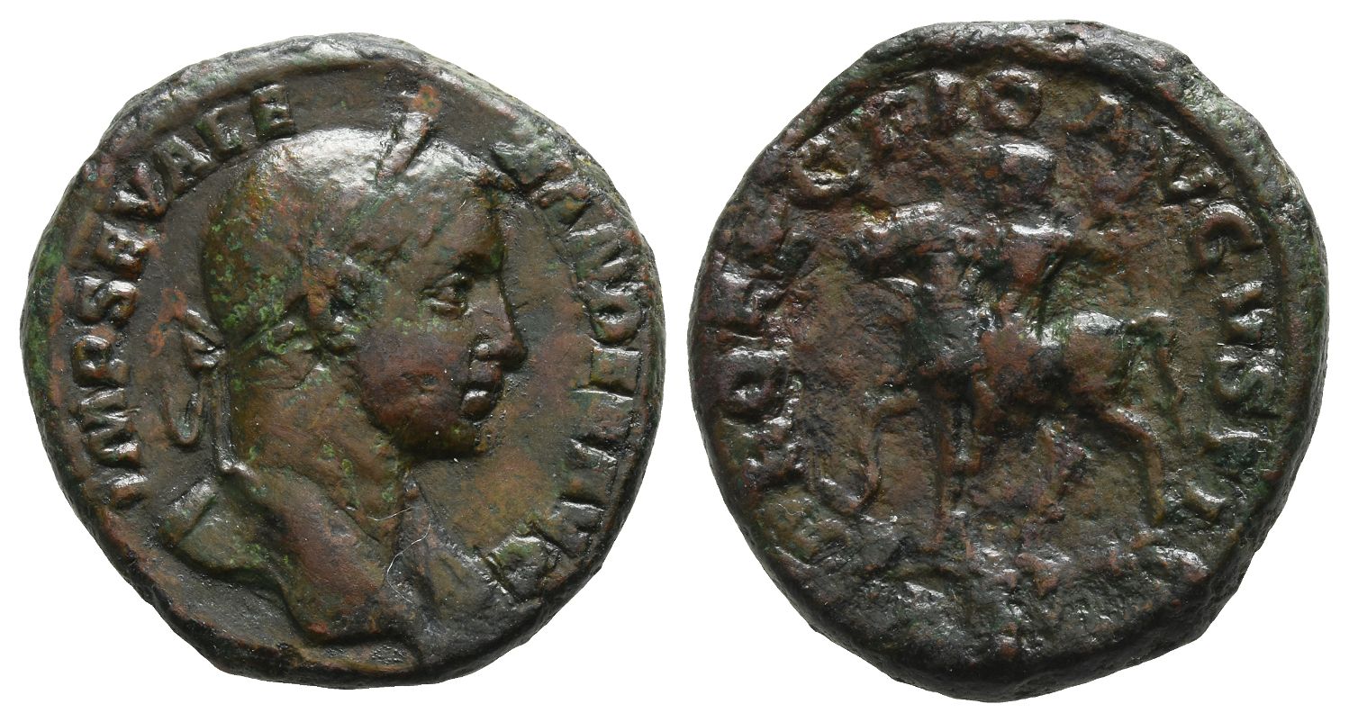 Rome mint; struck AD 231. IMP SEV ALE-XANDER AVG, laureate head to right, light drapery on far shoulder / PROFECTIO AVGVSTI, the Emperor on horseback to left, raising his right hand and holding spear with his left; S C in exergue. RIC IV 595b; Cohen 490 var.; BMCRE 751. 11.28gr, 26mm, 1h.