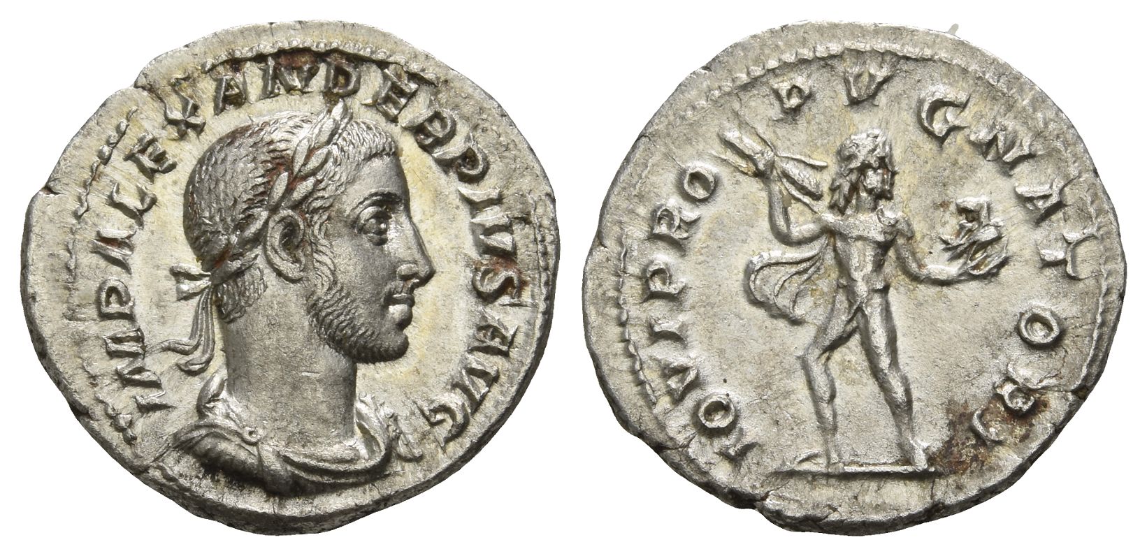 Rome mint; struck AD 232. IMP ALEXANDER PIVS AVG, laureate, draped and cuirassed bust to right / IOVI PROPVGNATORI, Jupiter advancing to left, head to right, holding thunderbolt and eagle. RIC IV 238; BMCRE 824; RSC 83. 3.03gr, 20mm, 7h.