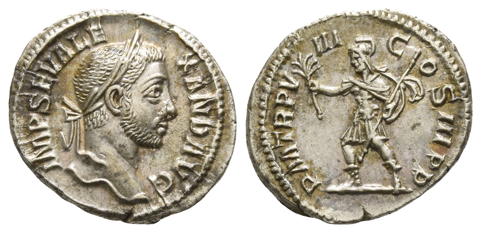 IMP SEV ALEXAND AVG, laureate head to right / P M TR P VIII COS III P P, Mars walking to left, holding olive branch, spear and shield. RIC IV 92; BMCRE 604; RSC 365. 3.40gr, 20mm, 12h.
