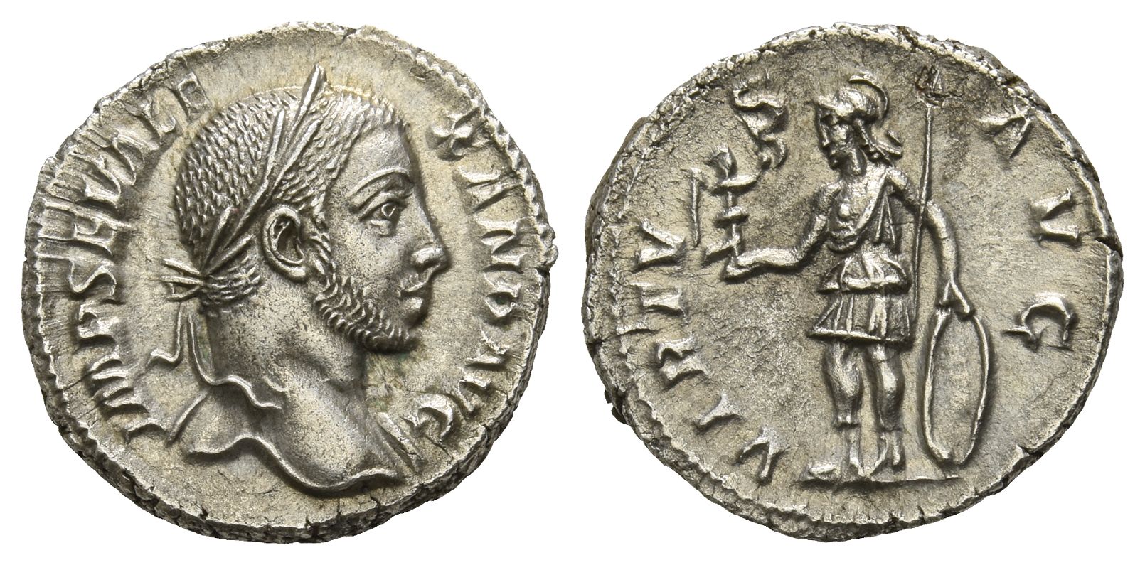 IMP SEV ALEXAND AVG, laureate head to right, slight drapery on left shoulder / VIRTV-S AVG, Virtus standing facing, head to left, holding Victory in her right hand and spear and shield with her left. RIC IV 220; BMCRE 709 var. (bust type); RSC 579a. 3.64gr, 18mm, 2h.
