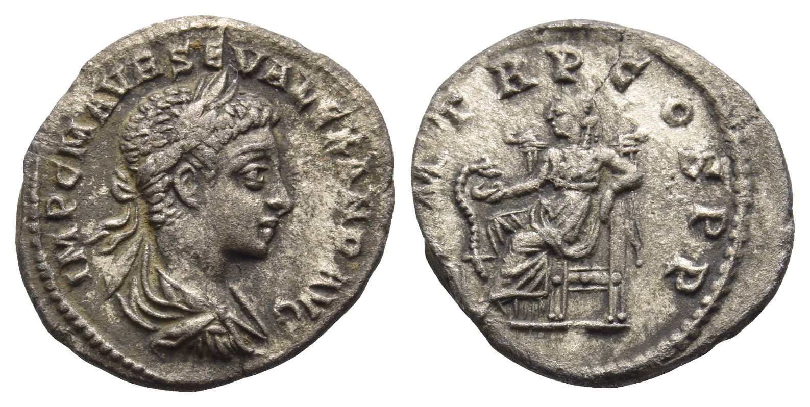 IMP C M AVR SEV ALEXAND AVG, laureate, draped and cuirassed bust to right / P M TR P COS P P, Salus seated to left, feeding out of patera snake coiled round altar and resting elbow on chair. RIC IV 14; BMCRE 33; RSC 218a. 2.49gr, 19mm, 6h.