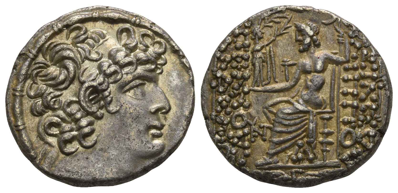 In the name and types of the Seleucid king Philip I Philadelphos. Dated year 3 of the Caesarean Era (47/6 BC). Diademed head to right / ΒΑΣΙΛΕΩΣ ΦΙΛΙΠΠΟΥ ΕΠΙΦΑΝΟΥΣ ΦΙΛΑΔΕΛΦΟΥ, Zeus Nicephorus seated to left; monogram of AYT to inner left, Γ (date) above thunderbolt in exergue; all within laurel wreath. RPC I 4127; McAlee 4; Prieur 4; SC 2491.1; HGC 9, 1360a. 15.57gr, 27mm, 1h.