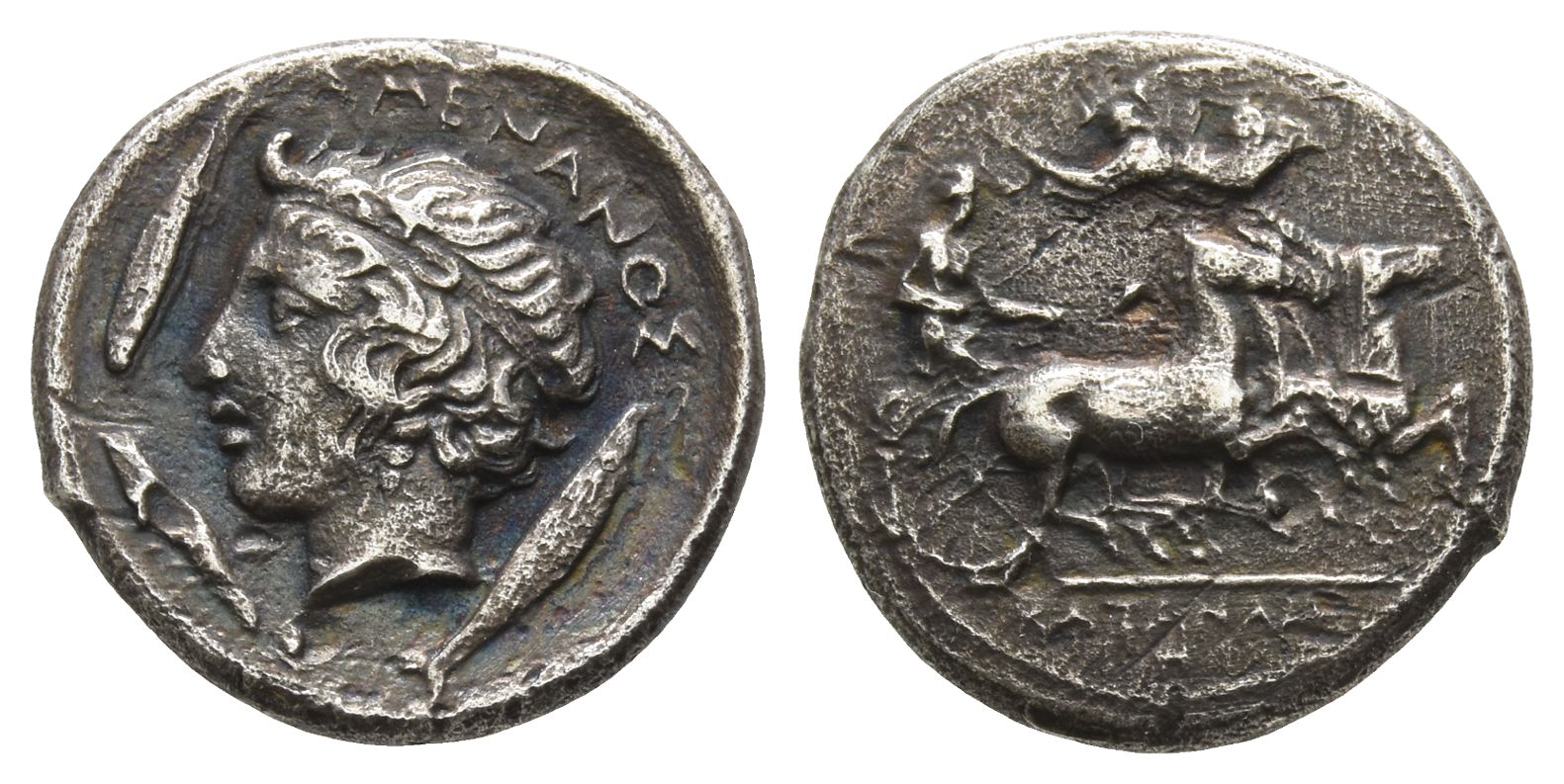 KATANAIΩ-N, charioteer driving quadriga galloping to right, holding kentron in his right hand and reins in his left; above, Nike flying to left, crowning the charioteer with wreath / AMENANOΣ, head of the river-god Amenanos to left, wearing taenia; two fish and crayfish around. HGC 2, 582; SNG ANS 1263; SNG Copenhagen 181. 3.81gr, 18mm, 12h.