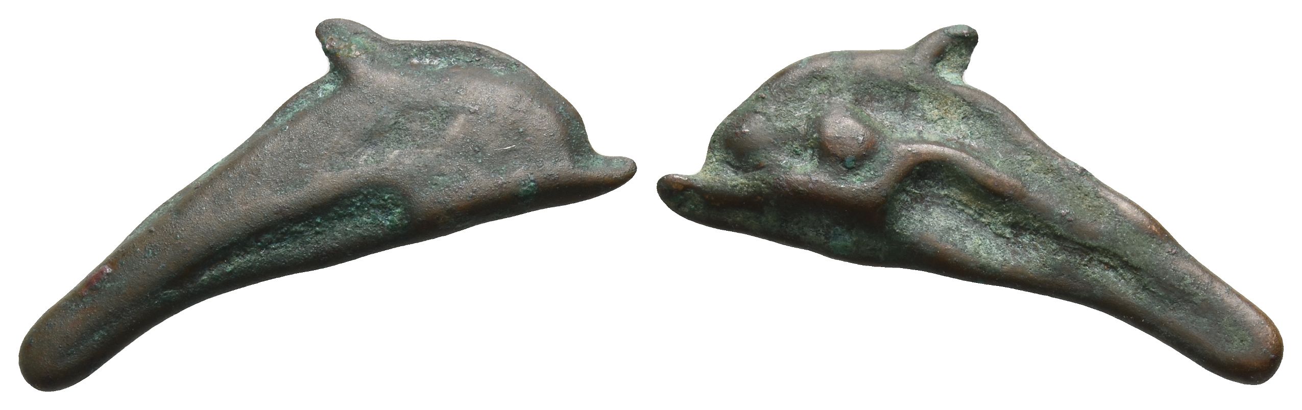 The method of casting this unique type of coin was adopted by the Gallic Celts who originally came from this region. Dolphins were generally struck in the form of a "tree" attached to the tail, although some examples appear to have been cast individually.