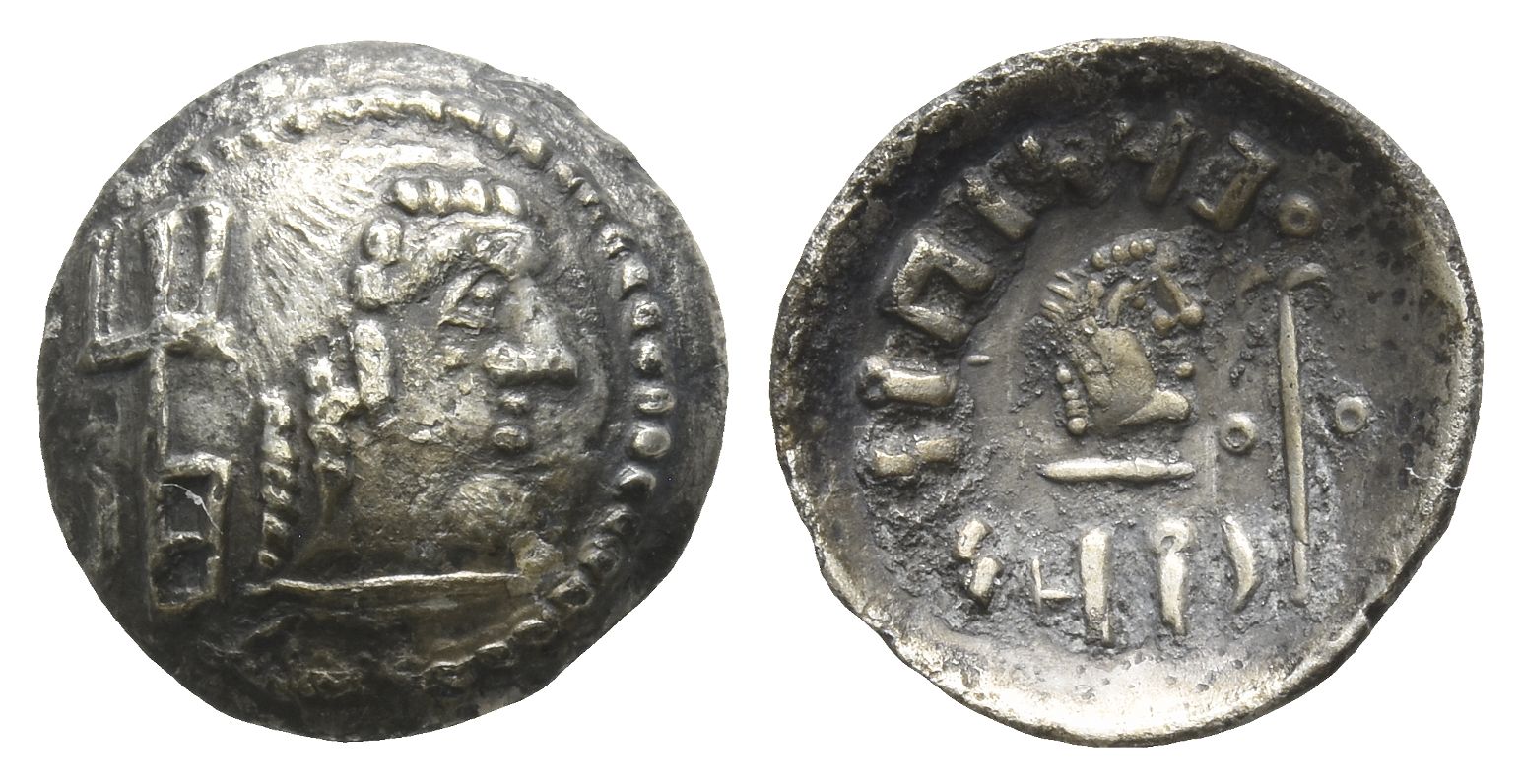 Raydan mint. Head to right within dotted circle interrupted by monogram to left / Small head to right; 'sceptre' to right. CAF 3.4i; Huth 441; SNG ANS 1595. 1.03gr, 14mm, 3h.
