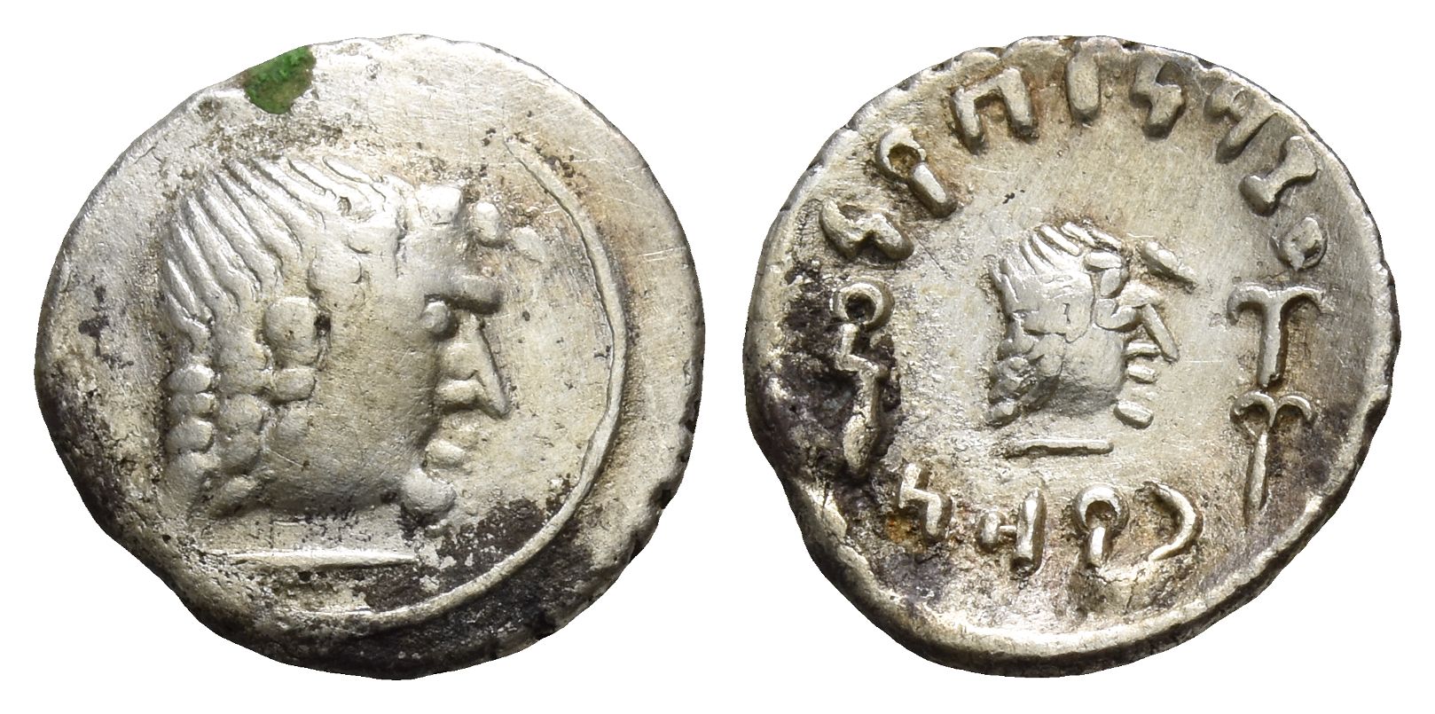 Head to right within circular torque / Small head to right; yanaf-monogram to left, 'sceptre' to right. CAF 3.2ai; Huth 429. 1.31gr, 14mm, 9h.