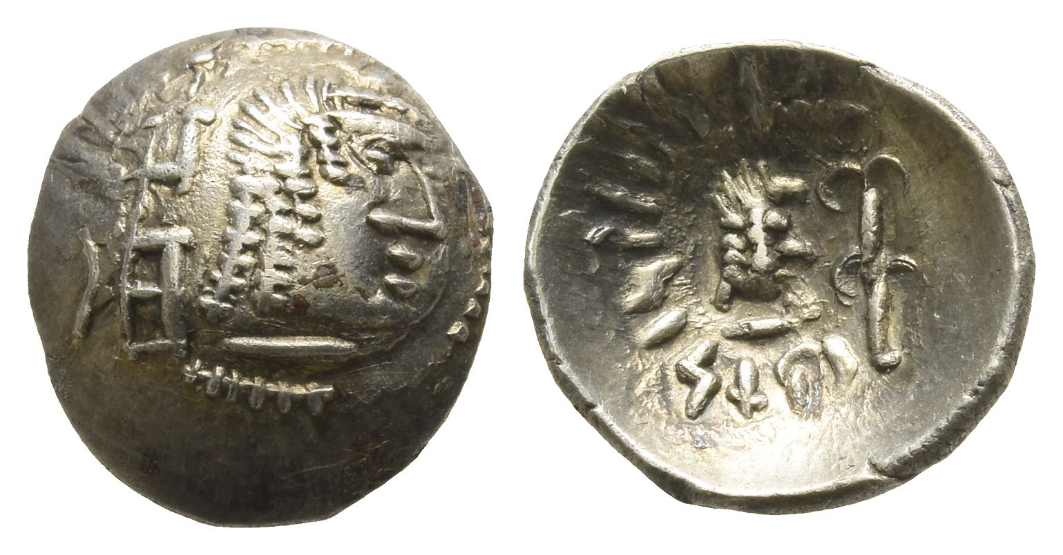 Bare head to right, within dotted border terminated by monogram / Small head to right; South Arabian legend around; 'sceptre' to right. CAF 3.4i; Huth 437-43; SNG ANS 1602-9. 0.98gr, 13mm, 3h.